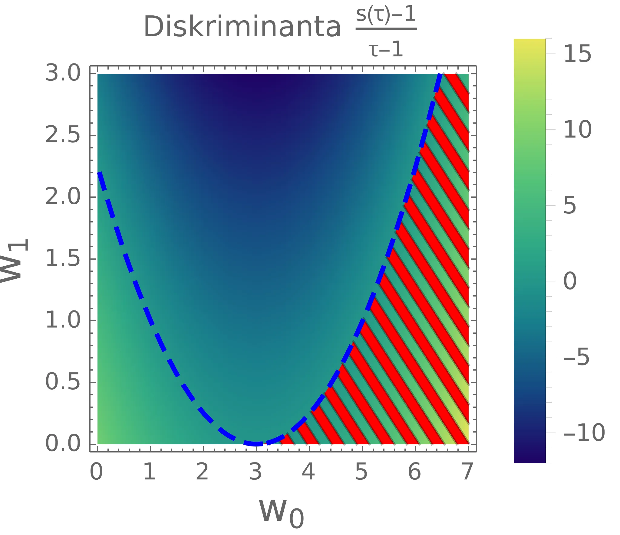 Pojav overshoot-anja se prav tako kot pri odprtih pogojih pojavi tudi pri zaprtih robnih pogojih (slika 1). A ker imamo zdaj dva prosta parametra \(w_0, w_1\) (namesto le enega), je določitev omejitve za preprečevanje overshoot-anja nekoliko težje. Ker poznamo potek hitrosti (13), lahko zapišemo tudi \(s(\tau)\), ki je nek polinom 3. stopnje. Ta polinom vedno poteka skozi točko \((\tau, s) = (1, 1)\), zato lahko njegovo obliko poenostavimo kot \[s(\tau) - 1 = (\tau - 1) Q(\tau),\] pri čemer je \(Q(\tau)\) nek kvadratični polinom \[Q(\tau) = 1 - t(1-w_0) - t^2(2 -w_0 - w_1),\] z ničlami tam, kjer je dosežena razdalja \(s(\tau) = 1\). Če je katera od teh dveh ničel \(\tau_{1,2}^{(Q)} \in (0, 1)\), je potek problematičen, saj semafor prevozimo pred \(\tau = 1\). Na sliki 11 je narisana diskriminanta \(Q(\tau)\) po parametrih \((w_0, w_1)\).