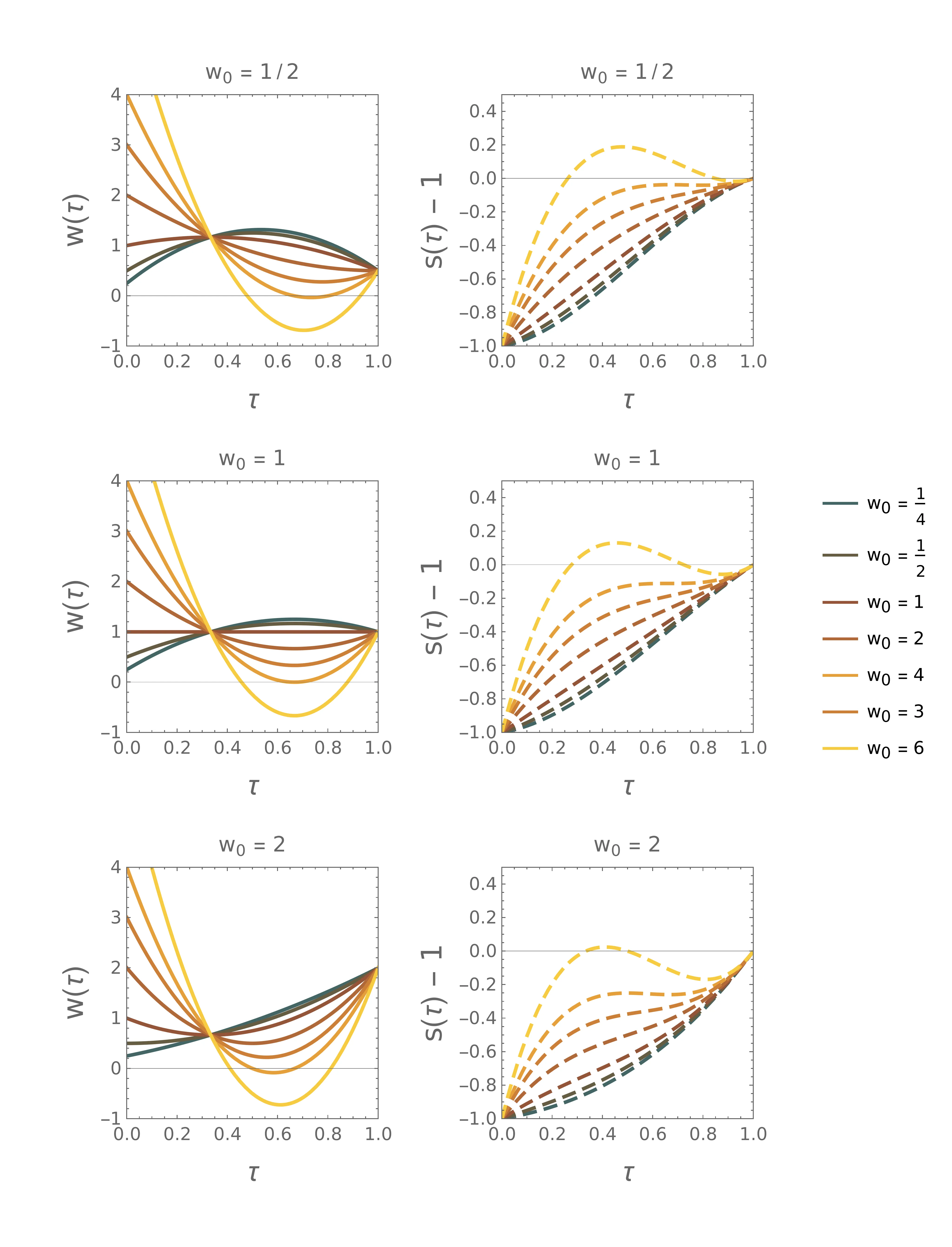 Pri uvedbi brezdimenzijskih količin v 3 smo implicitno predpostavili, da sta \(T, v_0\) neničelna. Za \(T\) je to smiselna predpostavka (in bila bi tudi za \(L\)), a povsem naraven je primer, ko je \(v_0 = 0\). Pri uporabi brezdimenzijskih količin \((\tau, u, \eta)\) bi morali primer \(v_0 = 0\) razrešiti posebej – a bolj elegantno lahko vpeljemo bolj robustne brezdimenzijske količine, ki se tej degeneraciji izognejo \begin{equation}\tau :=\frac{t}{T}, \quad w :=\frac{v}{L/T}, \quad w_0 :=\frac{v_0}{L/T}. \label{eq:nondim2}\end{equation} V novih količninah \((\tau, w, w_0)\) lahko Lagrangian zapišemo kot \begin{equation}\mathcal{L}(w(\tau), \dot{w}(\tau)) :=\dot{w}^2 - \Lambda w, \label{eq:L-new}\end{equation} pri čemer smo podobno kot pri starih količinah vpeljali nov multiplikator \(\Lambda :=\frac{T^3}{L}\lambda\). Sama diferencialna enačba za rešitve ostaja enaka kot (5), le z \(\Lambda\) namesto \(\widetilde{\lambda}\) in z robnimi pogoji \begin{equation}\text{odprta robna pogoja: } w(0) = w_0, \quad \dot{w}(1) = 0, \label{eq:open-boundary}\end{equation} s čimer je rešitev oblike \begin{equation}w(\tau) = w_0 + \frac{\Lambda}{4} \left(2\tau - \tau^2 \right), \label{eq:open-lambda-ODE}\end{equation} izmed njih pa izberemo tisto, ki ustreza vezi \(\int_0^1 w \,\mathrm{d}\tau = 1\). Z vstavljanjem dobljenega \(\Lambda\) nazaj v izraz za \(w(\tau)\), dobimo odvisnost hitrosti \begin{equation}w(\tau) = w_0 + (1-w_0) \left( 3\tau - \frac{3\tau^2}{2} \right). \label{eq:open-w}\end{equation} da smo z uvedbo drugih brezdimenzijskih enot, kjer je namesto brezdimenzijske poti \(\eta\) ključni parameter brezdimenzijska začetna hitrost \(w_0\), pridobili lepše obnašanje v degeneriranem primeru \(v_0 = 0\). Na sliki 2 lahko vidimo obliko rešitve (11), ko spreminjamo začetno hitrost \(w_0\).
