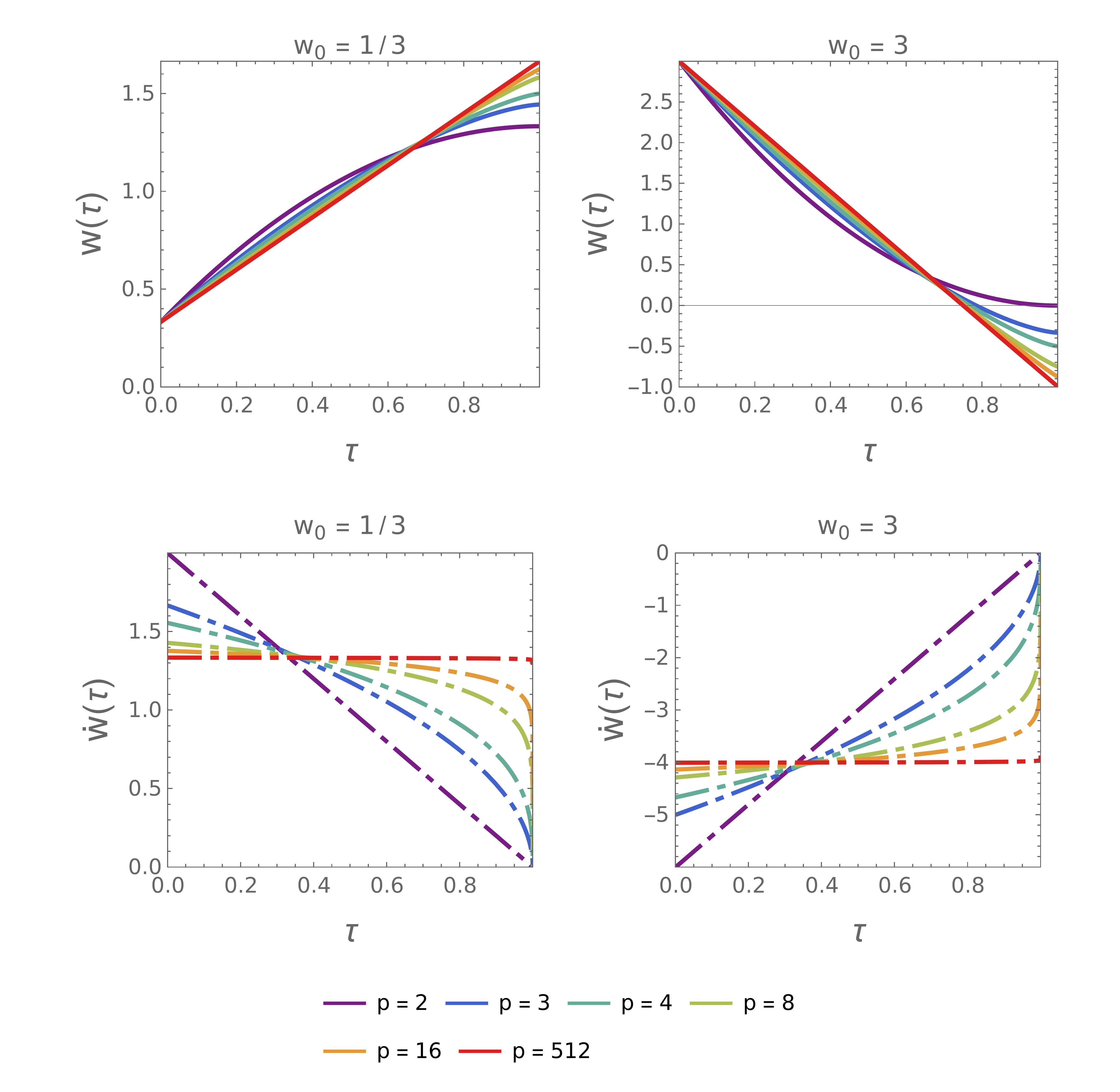 Dobljeno rešitev malce poenostavimo na roke in zapišemo \begin{equation}w(\tau) = w_0 + \frac{p-1}{p} \left( \frac{\Lambda}{p} \right)^{\frac{1}{p-1}} \left( 1 - \left[ 1-\tau \right]^{\frac{p}{p-1}} \right). \label{eq:2p-lambda-ODE}\end{equation} Takoj lahko preverimo, da je za \(p=2\) enačba (15) kar enake oblike kot (10). Preostane nam le še vez \(\int_0^1 w\,\mathrm{d}\tau = 1\). Ko integiramo (15), upoštevamo že prej upravičeno predpostavko \(\Lambda > 0\). Ko dobljeno enačbo rešimo za \(\Lambda\) in vsavimo nazaj v (15), dobimo končno obliko rešitve \begin{equation}w(\tau) = w_0 + \frac{(2p-1)(1-w_0)}{p} \left( 1 - \left[ 1-\tau \right]^{\frac{p}{p-1}} \right). \label{eq:2p-w}\end{equation} Na sliki 3 vidimo, kako povečevanje eksponenta \(p\) vpliva na optimalne rešitve. Ko se \(p\) veča, postajajo rešitve vedno bolj podobne limitni premici \[w(\tau) = w_0 + 2t(1-w_0).\] Še vedno pa (vsaj v limitnem smislu) velja, da je \(\dot{w}(1) = 0\), čeprav je padec na \(\dot{w} = 0\) vedno bolj oster za višje \(p\) (slika 3 spodaj).