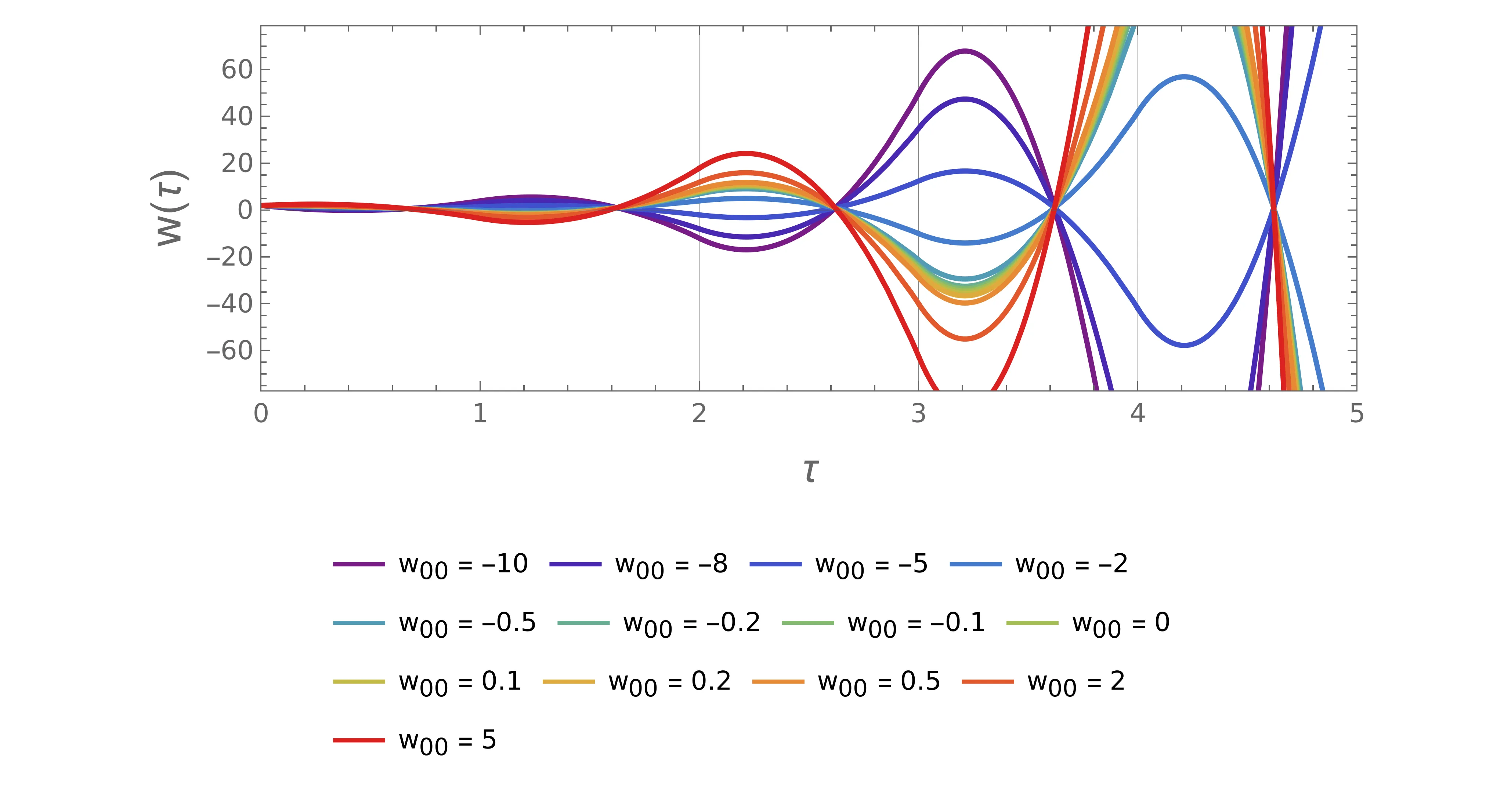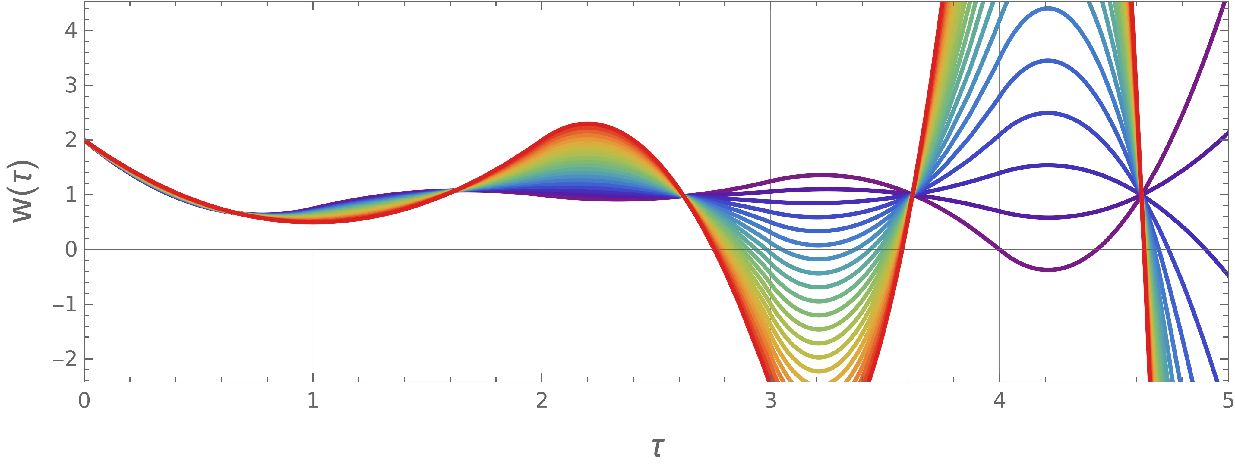 Alternativno enačbo rešujemo tako, da robne pogoje določimo kar iz zveznosti in zvezne odvedljivosti. To dosežemo tako, da izberemo nek \(w_{00}\) in nek \(\dot{w}_{00}\), nato pa rešimo enačbo (5), apliciramo vez (1), nato pa začetne pogoje za naslednji odsek razberemo kar iz te funkcije na naslednjem robu \(\tau_n + 1\). Tako rešitev za \(w_0 = 2\) si pogledamo za nekaj različnih \(\dot{w}_{00}\) na sliki 10. Vidimo, da rešitev zna kar podivjati, razen za en ozek obseg parametrov.