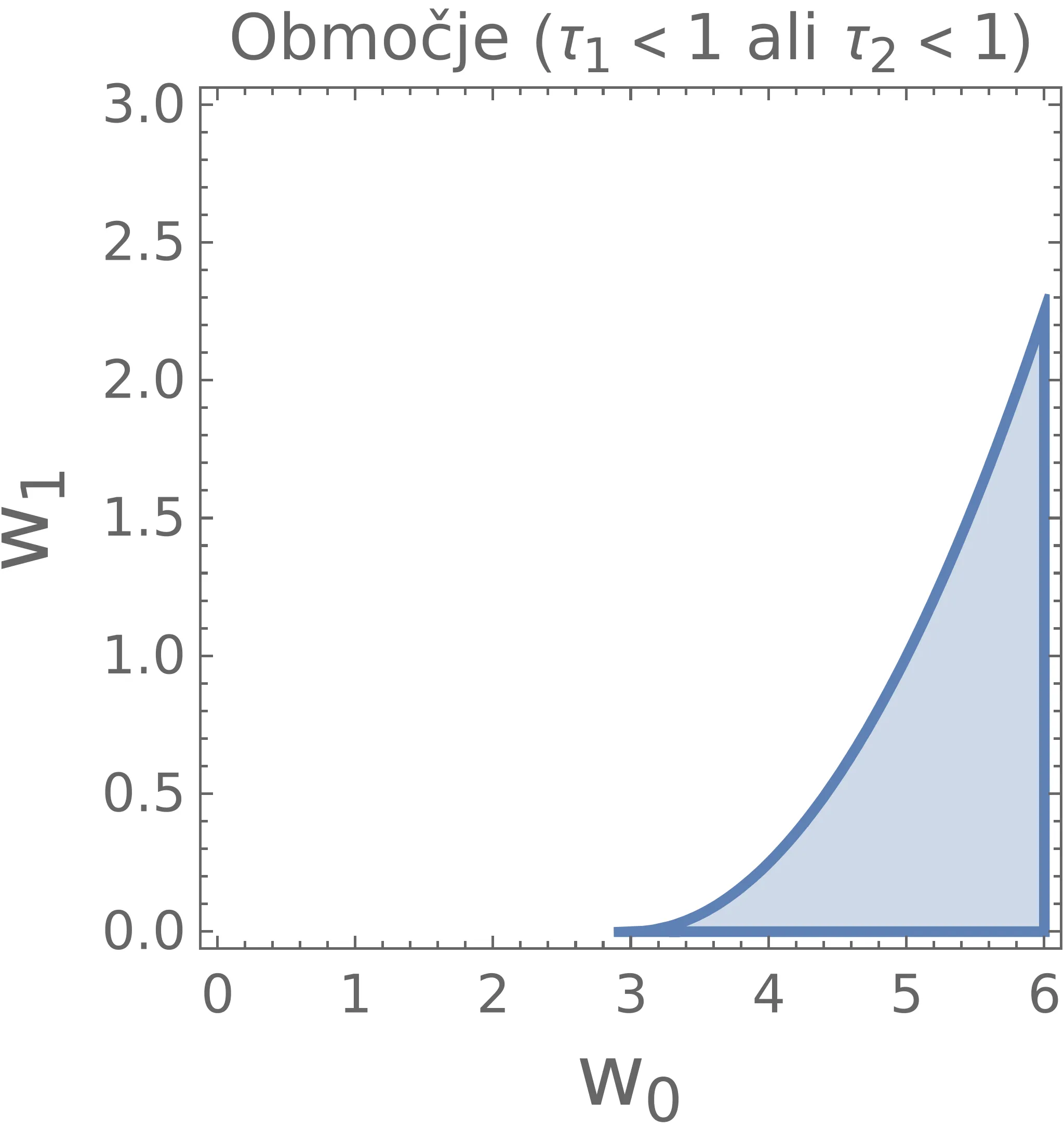 Zanima nas območje oz. pogoj za parametre, kjer je prisotno overshoot obnašanje. Prvi pogoj dobimo iz diskriminante \(Q(\tau)\) – če naj bo prisoten overshoot, bo \(Q(\tau)\) imel dve ničli. Pogoj, da ima \(Q(\tau)\) dve ničji, je \[w_1 < \frac{1}{4} \big(9 - 6w_0 + w_0^2\big).\] Potencialno območje je torej pod to krivuljo (modra črtkana parabola na sliki 11). Kot opisano na sliki 12, pa tudi območje \(w_0 < 3\) pod krivuljo ni problematično. Območje overshoot obnašanja je torej le območje, označeno z rdečo šrafirano na sliki 11. Komplement tega pogoja nam omogoči, da se overshoot-anju izognemo, sicer pod pogojem \[w_0 < 3 \quad \text{ali} \quad w_1 \ge \frac{1}{4} \big(9 - 6w_0 + w_0^2\big).\]