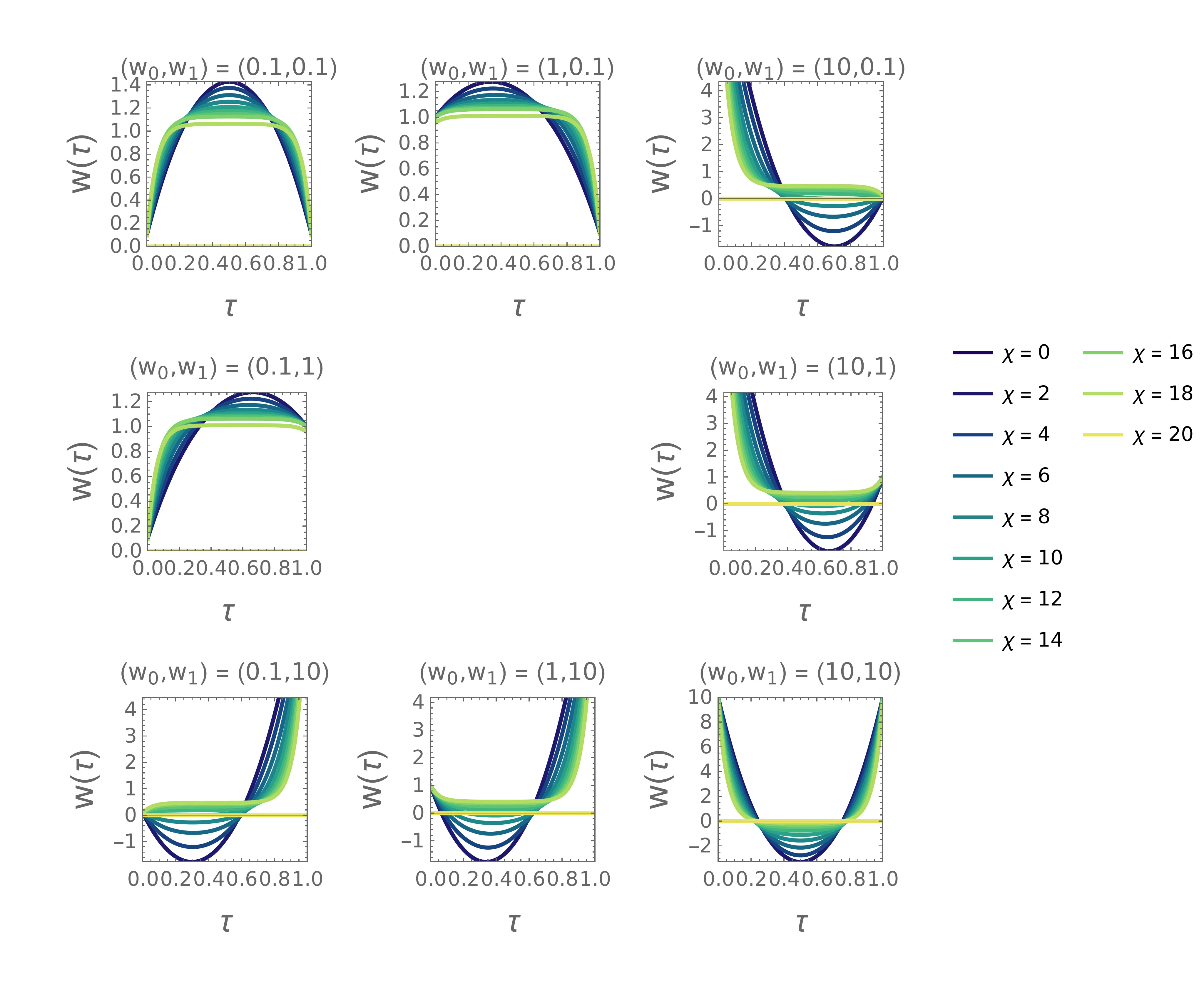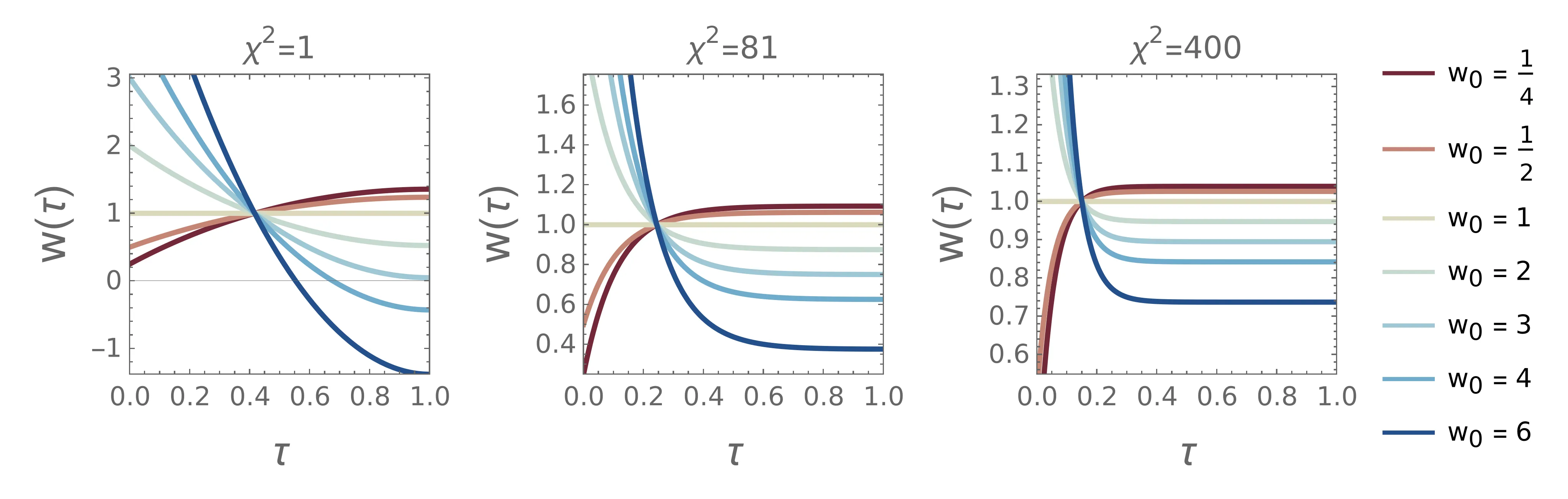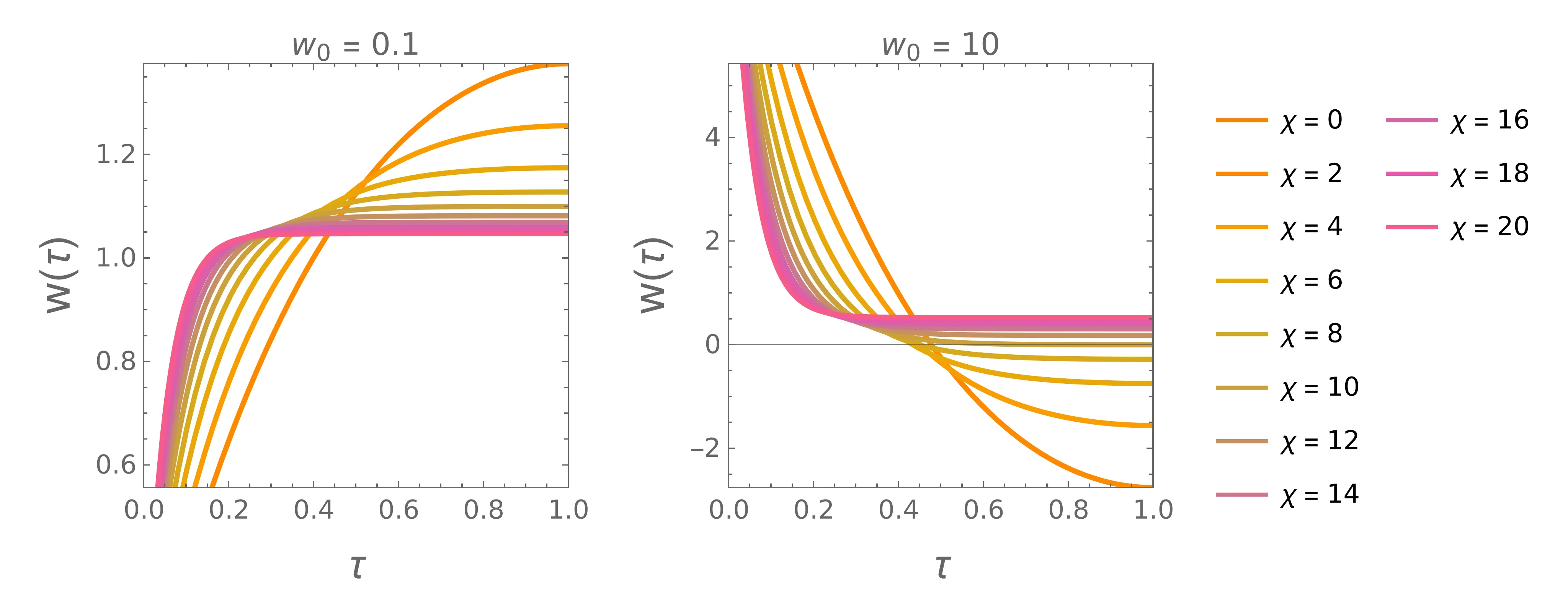 \(w(\tau)\). Vidimo, da se ob večjem \(\chi\) (bolj