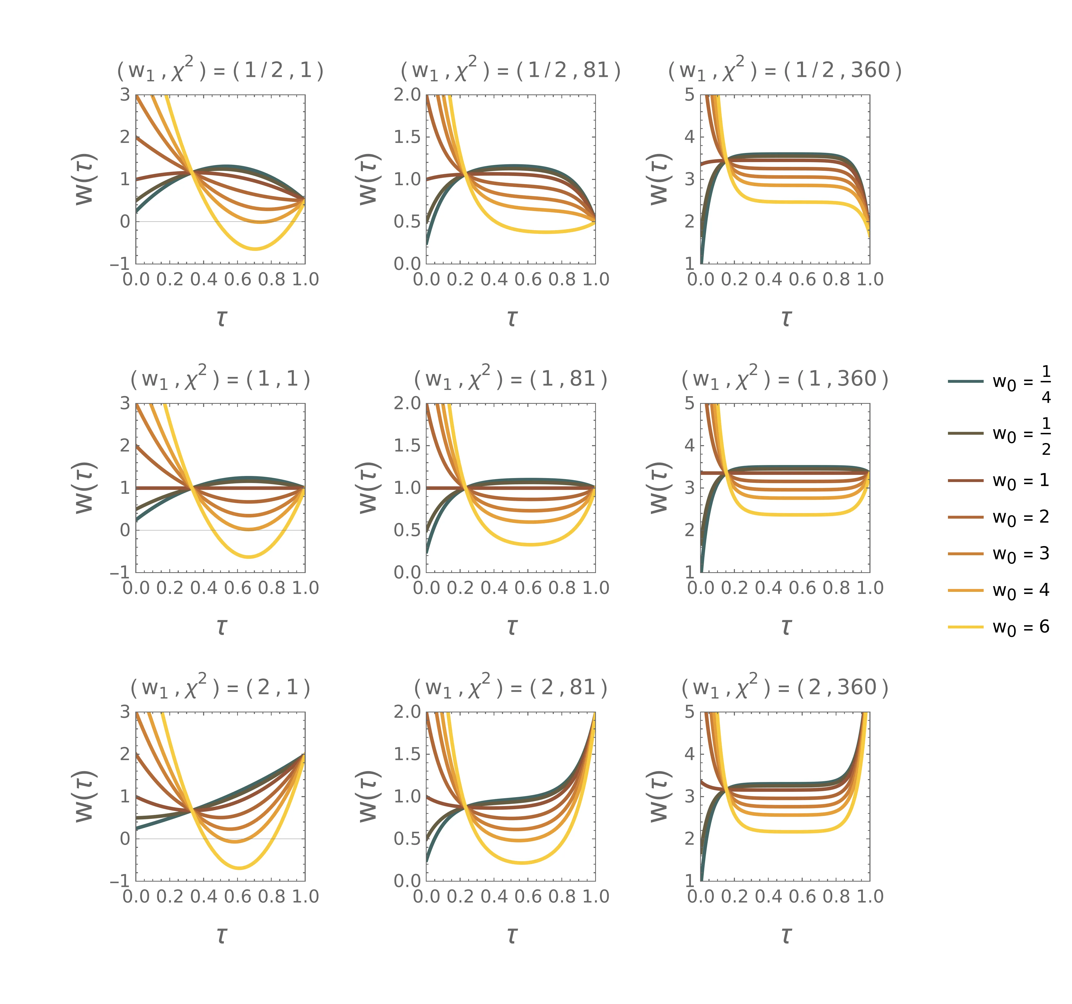 Poglejmo si poteke hitrosti, ki ustrezajo Lagrangianu s členom \(\chi^2 w^2\) še za zaprt robni pogoj (12). Temu ustreza rešitev (18) diferencialne enačbe \[\begin{aligned} w(\tau) &= \Lambda e^{-\chi\tau} \frac{e^\chi - e^{2\chi} - e^{\chi t} + e^{2\chi t} + e^{2\chi + \chi \tau} - e^{\chi + 2\chi \tau}}{2\chi^2(e^{2\chi} - 1)}. \nonumber \\ &+ e^{-\chi\tau} \frac{2w_0 e^{2\chi} - 2w_0 e^{2\chi\tau} -2 w_1 e^{\chi} + 2 w_1 \chi^2 e^{\chi + 2\chi\tau}}{2(e^{2\chi} - 1)}. \end{aligned}\] Ob upoštevanju vezi (1) dobimo za multiplikator \[\Lambda = \frac{2\chi^2 \left( \chi - w_0 \tanh \frac{\chi}{2} - w_1 \tanh \frac{chi}{2} \right)}{\chi - 2\tanh \frac{\chi}{2}}.\] Za kar nekaj vrednosti parametrov \((\chi^2, w_0, w_1)\) narišemo poteke na slikah 6, 7. Spet vidimo oblikovanje jasnih platojev za večje \(\chi\) (bolj močno kaznovana hitrost). Če bi kaznovali le hitrost (limita \(\chi \to \infty\)), bi optimalna oblika bila konstanta \(w = 1\), s koračnim skokom iz \(w_0\) na \(1\) pri \(\tau = 0\) in spet skokom iz \(w = 1\) na \(w_1\) pri \(\tau = 1\). Ta dva koračna skoka bi predstavljala dve delta funkciji za pospešek, ko je v Lagrangianu prisoten še \(\dot{w}^2\) člen, se to ne zgodi, temveč imamo namesto koračnega vseeno nek gladek prehod. Večji kot je \(\chi\), bolj oster je prehod in bolj podoben je koračnemu.
