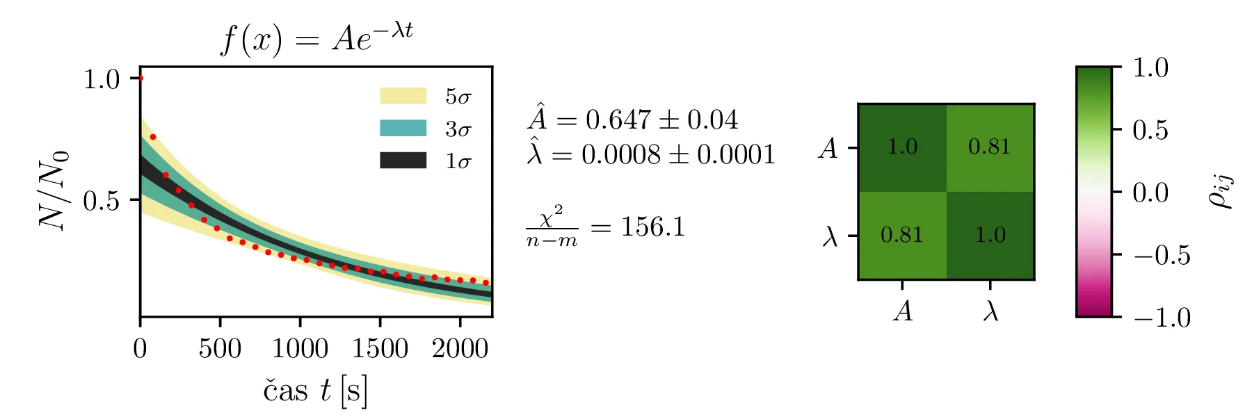 Rezultati in intervali zaupanja za 1. linearizirani model so prikazani na sliki 1 levo. Po transformaciji \((A, B) \mapsto (y_0, a)\) dobimo rezultat na sliki 1 desno. Po tej transformaciji dobimo za reducirani \(\chi^2\) vrednost \(4.3\), kar pomeni, da je model preveč preprost ali pa da so podcenjene naše napake. Nekoliko boljši \(\chi^2 / (N-1)\) nam da 2. model, nelinearizirani model funkcijske oblike (1).