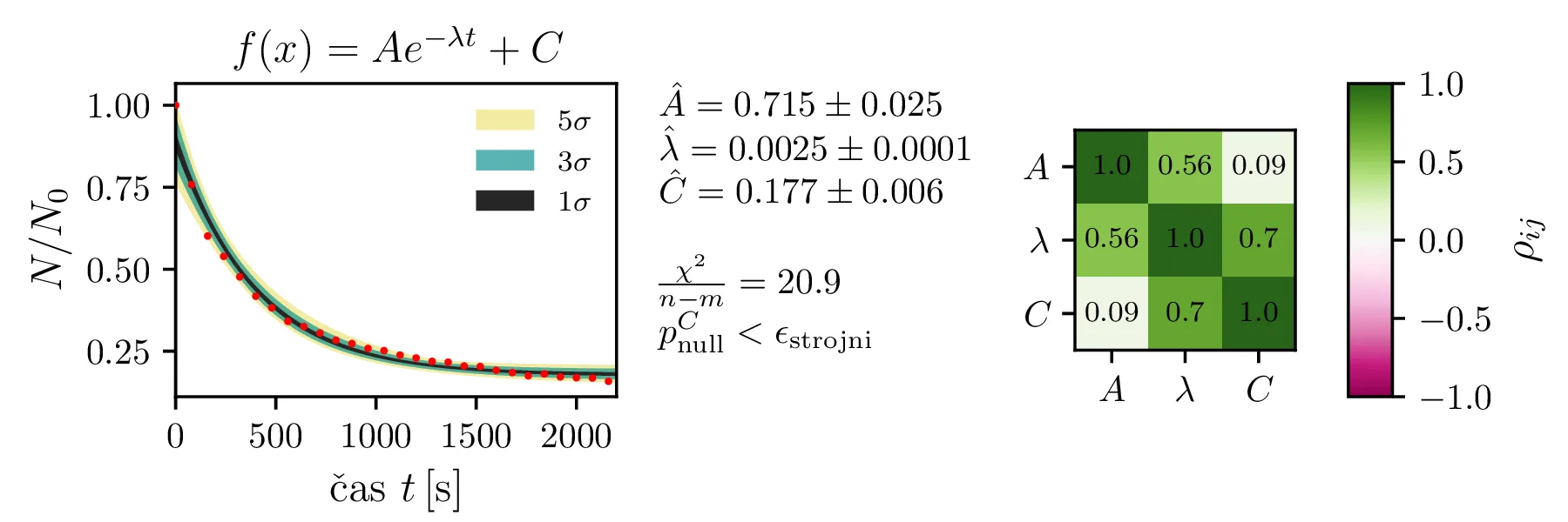 Ker je za podatki, ki jih merimo, proces radioaktivnega razpada, so naše naključne spremenljivke \(N(t_i)\) porazdeljene Poissonovsko. Tedaj je torej povsem naravno, da je tudi njihova varianca enaka \(N\), za napaka pa vzamemo \[\sigma_N \approx \sqrt{N}.\]