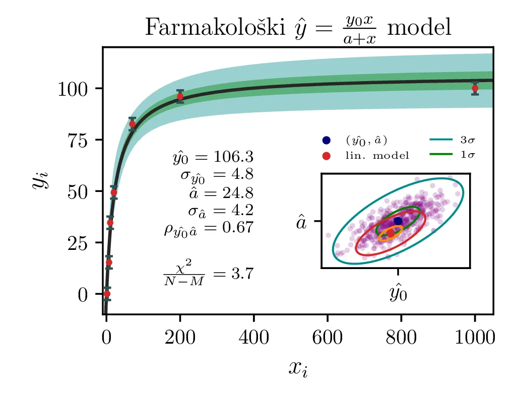 Lineariziran model \(1/y = A + B (1/x)\), parametra \(y_0, a\) nato dobimo z inverzno preslikavo (4), z Jakobianom (5),