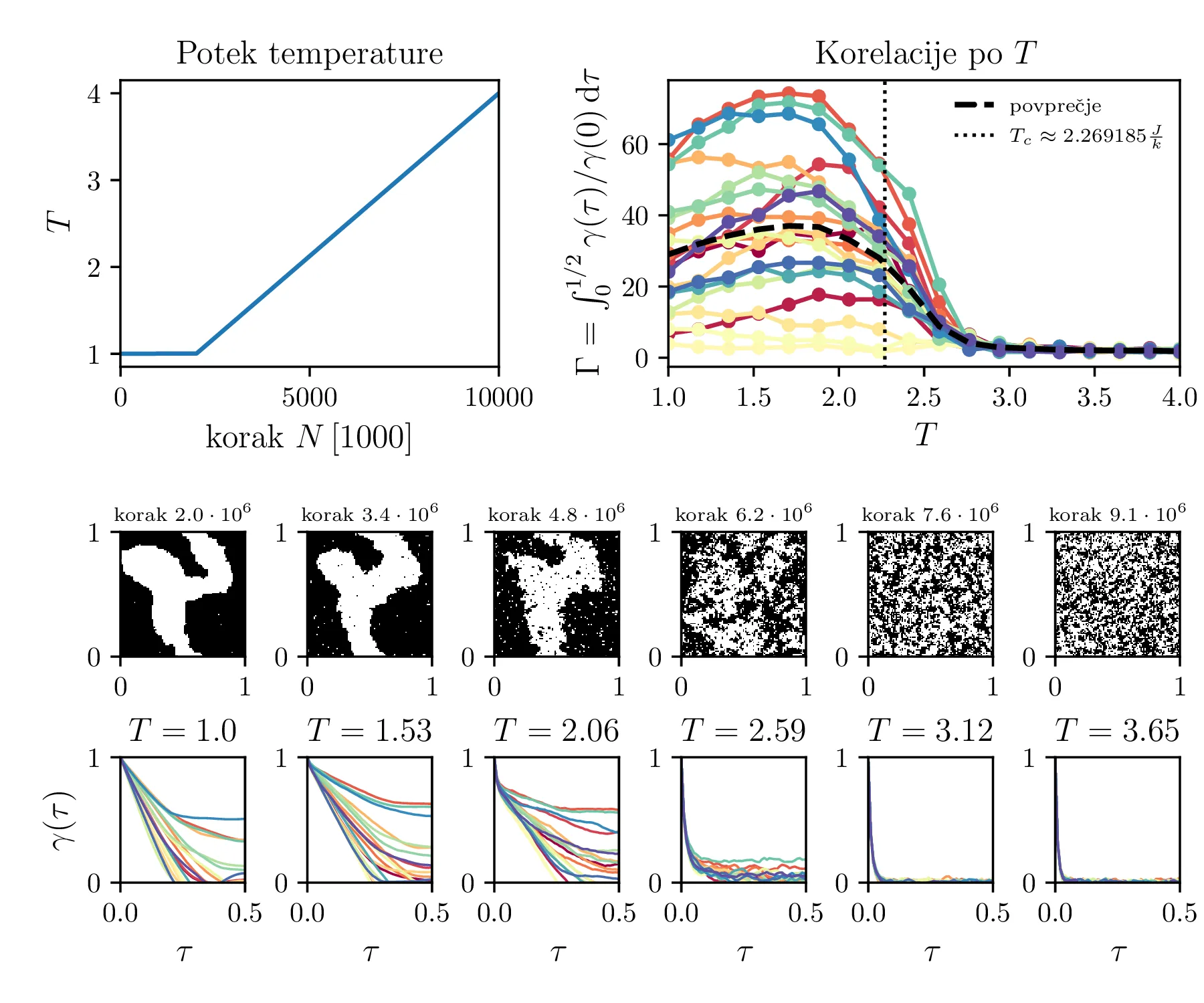 Preko autokorelacije sem poskusil kvantificirati fazni prehod, ki se pri Isingovem modelu po analitični napovedi pojavi pri \(T_c \approx 2.269185 \frac{J}{k}\). V ta namen sem Metropolis algoritem pognal z spremenljivo temperaturo \(T(t)\) (glej sliko 13 zgoraj levo). Nato sem iz celotnega poteka vzorčil 18 stanj pri različnih \(T\) in za njih izračunal \(\gamma(\tau)\) normirane autokorelacije v \(x\)-smereh. Šest izmed teh 18 stanj in njihove normirane \(\gamma(\tau)\) vidimo na sliki 13 spodaj. Kot indikator razdalje autokorelacij sem vzel kar njen integral \(\Gamma(T) :=\int_0^{1/2} \frac{\gamma(\tau)}{\gamma(0)} \,\mathrm{d}\tau\). Nato sem odvisnost \(\Gamma(T)\) narisal na sliki 13, sicer sem to ponovil za \(20\) simulacij dolgih po \(N = 10^7\) korakov. Te odvisnosti \(\Gamma(T)\) imajo pričakovan padec ko višamo temperaturo in magnetne domene nizkotemperaturne faze izginejo.