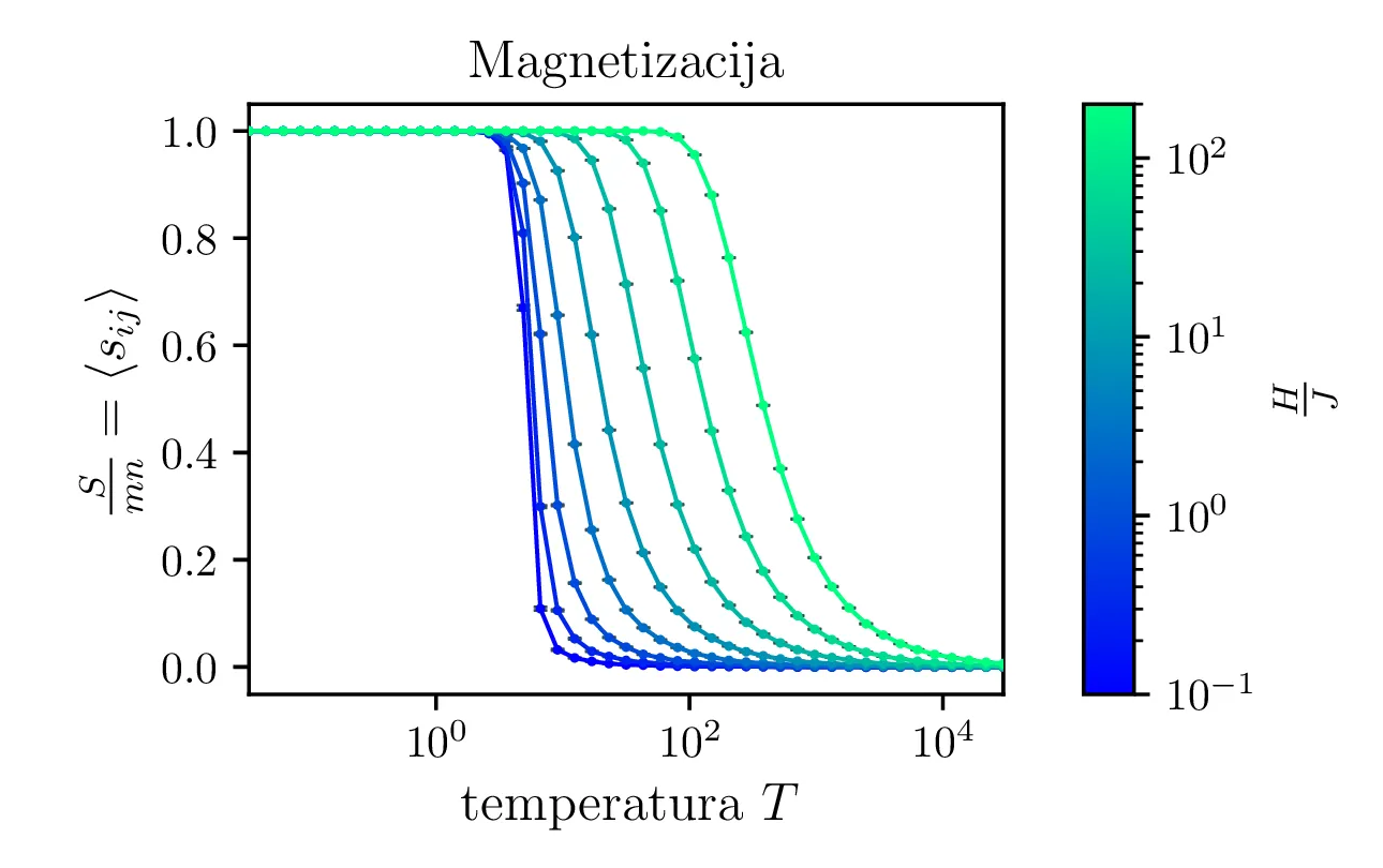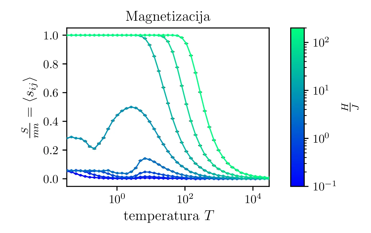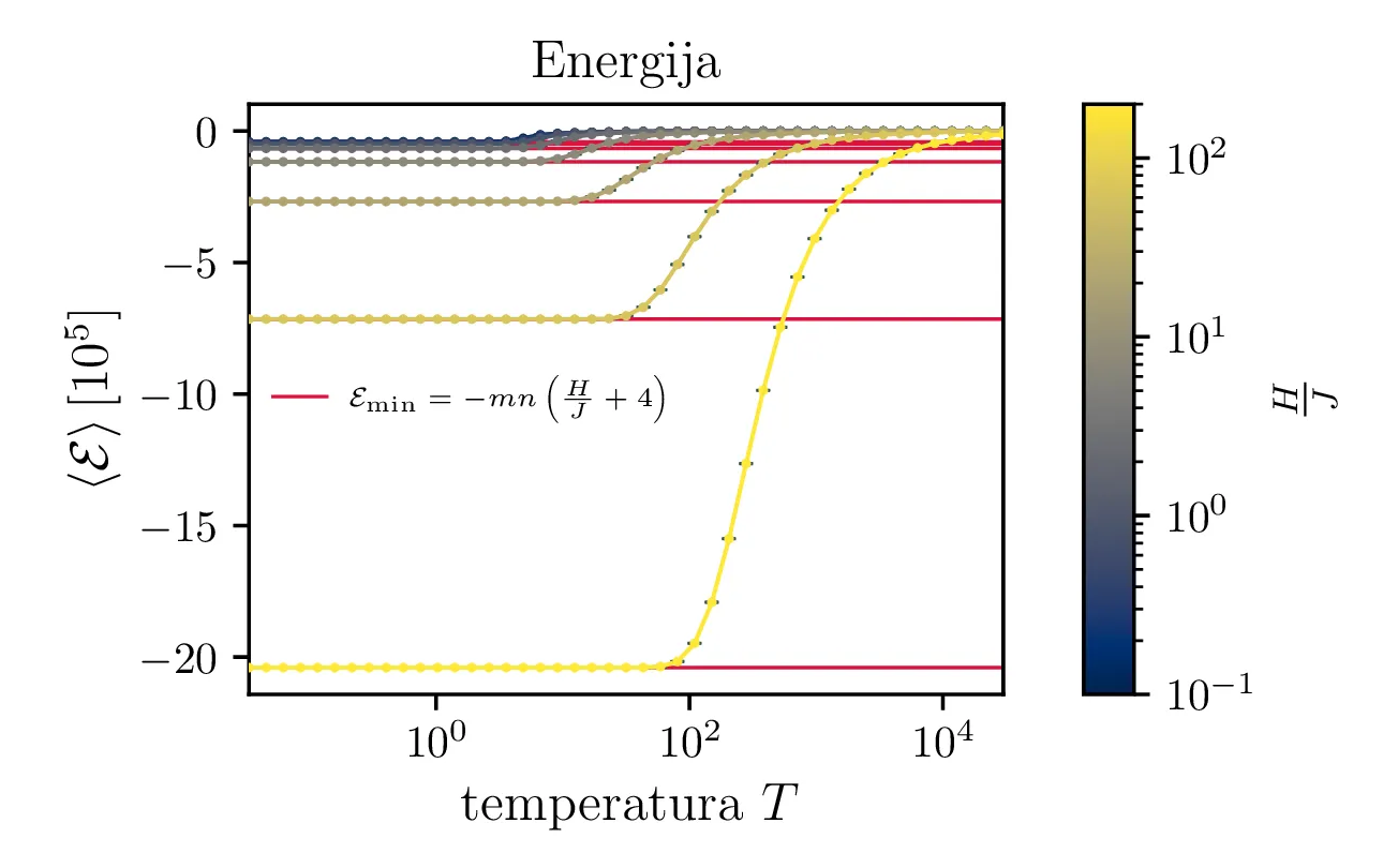 Na sliki 8 levo vidimo temperaturne odvisnosti energije Isingovega modela. Za močnejša zunanja polja je značilna višja temperatura energijskega prehoda, pri kateri sistem "kristalizira" v osnovno stanje z najnižjo možno energijo, kjer so vsi spini orientirani v isto smer \[\mathcal{E}_\mathrm{min} = mn \left( \frac{H}{J} + 4 \right).\] Za Isingov model lahko specifično toploto izračunamo popolnoma analogno kot za molekularno verižico v 2.4, torej kot \(C = \frac{\mathop{\mathrm{Var}}[\mathcal{E}]}{T^2}\), pri čemer standardno napako izračunamo preko 20 neprekrivajočih batch-ov. Tako izračunano specifično toploto vidimo na sliki 8 desno.