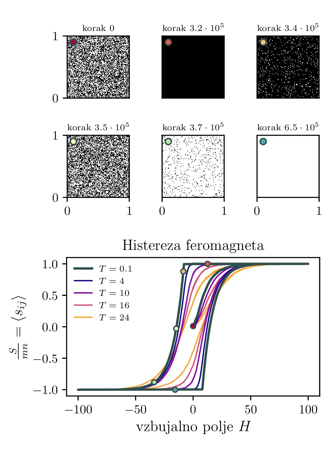 Še eno zanimivo fizikalno obnašanje feromagnetnih materialov je histereza magnetizacije pri spreminjanju vzbujalnega polja \(H_t\) po času \(t\). Tedaj krivulja \(t \mapsto (H_t, S(H_t))\) ne opisuje grafa neke funkcije \(S(H)\), temveč je bolj kompleksna, ciklična krivulja (glej sliko 12 spodaj). Histerezno obnašanje lahko relativno enostavno opazimo v Isingovem modelu, če le vstavimo časovno spreminjajoče polje \[H_t = H(T) = H_0 \cos({3\cdot 2\pi t/N}).\] Na sliki 12 vidimo obnašanje Isingovega \(100\times 100\) modela za \(H_0 = 100\), vključno z vmesnimi mikrostanji, ki lepo ilustrirajo celoten histerezni cikel. Začnemo v točki \((H, S) = (0, 0)\), kjer je sistem naključno urejen. Nato se s povečevanjem vzbujalnega polja \(H\) sistem povsem uredi v tej \(+1\) smeri. Da to urejenost podremo in sistem uredimo spet v drugo smer negativnega polja \(-1\), mora \(H\) polje postati znatno negativno. Tako torej samo urejeno \(\pm 1\) stanje sistema deluje kot spomin tega, kakšen je bil \(H\) ob prejšnjih časih.