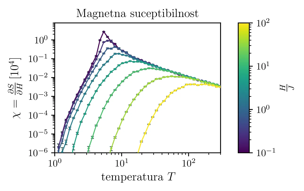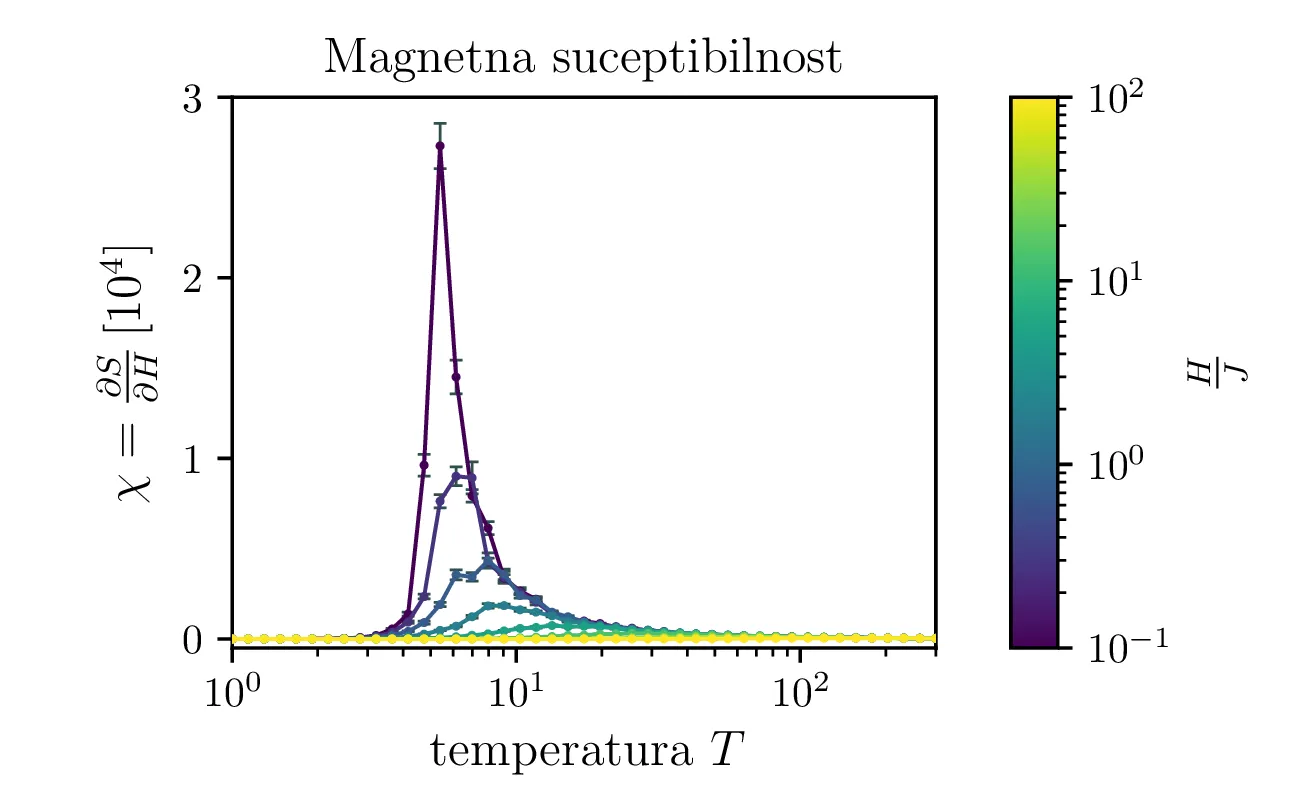 Podobno kot je specifična toplota odvod pričakovane energije \(C = \frac{\partial \langle \mathcal{E} \rangle}{\partial T}\), je magnetna susceptibilnost odvod magnetizacije (pričakovane vrednosti \(S = mn \langle s_{ij} \rangle\)) \[\chi = \frac{\partial S}{\partial H}.\] Tako lahko po zelo podobnemu argumentu kot tisti v 2.4 zaključimo, da je \[\chi = \frac{\mathop{\mathrm{Var}}\left[\sum_{ij} s_{ij}\right]}{T},\] pri čemer uporabljamo brezdimenzijsko temperaturo (glej 2.1). Na sliki 10 vidimo magnetizacijo in njene skoke s padanjem temperature. Pripadajoče temu vidimo na sliki 11 izračunano susceptibilnost, ki ima zelo visok vrh za majhna polja, ko je feromagnet še daleč od zasičenja. To se ujema z resničnim obnašanjem feromagnetov.