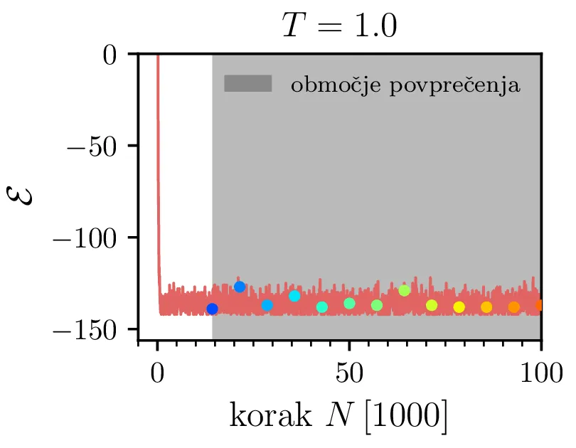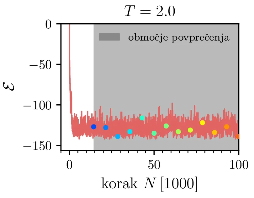 Predlagano potezo sprejmemo tudi v primeru, da je \(\Delta\mathcal{E} > 0\), a le z verjetnostjo \(P_\mathrm{sprejetja} = e^{-\Delta \mathcal{E} / T}\) (tu uporabljamo brezdimenzijsko temperaturo, glej 2.1).