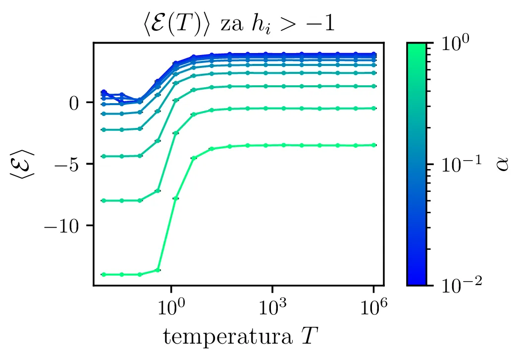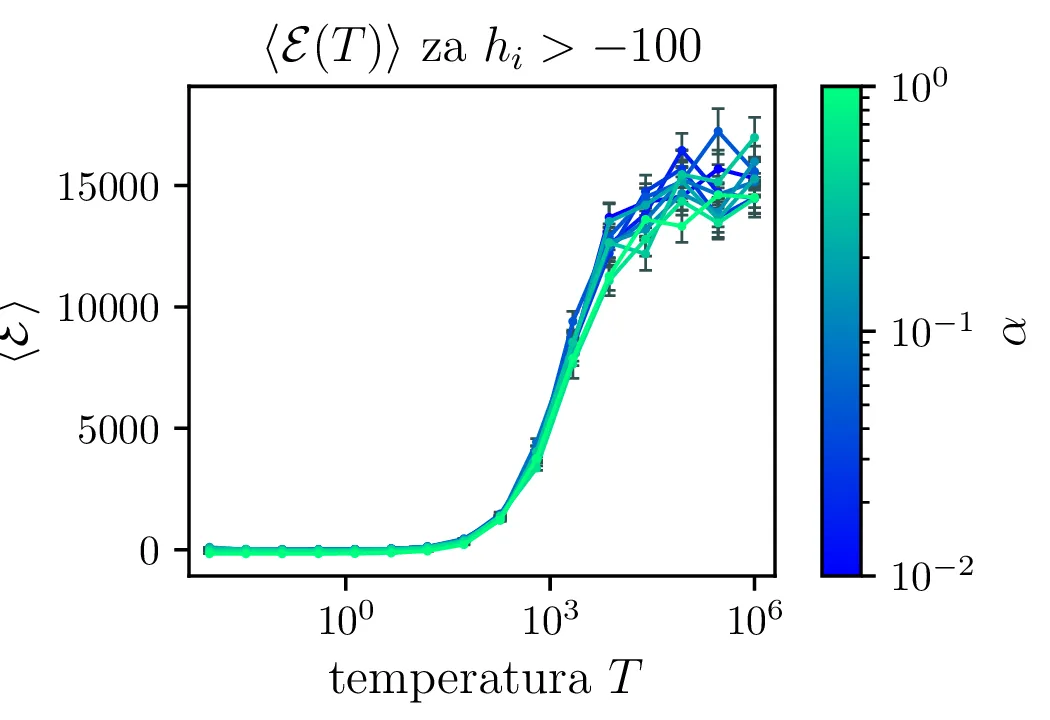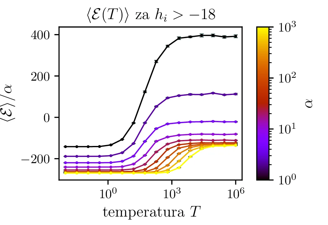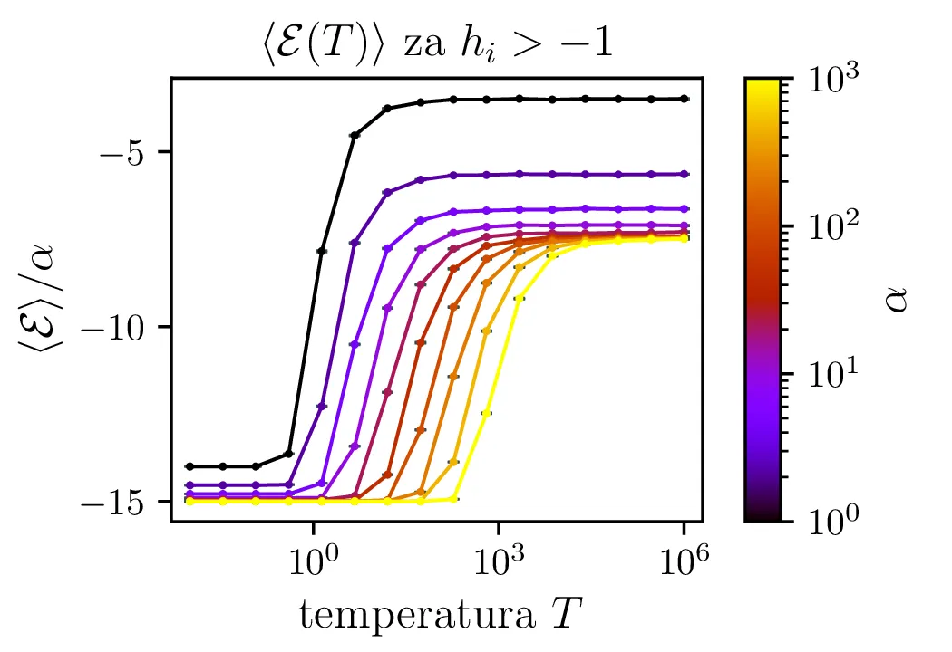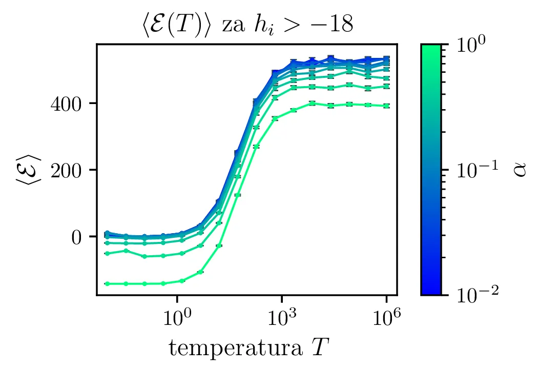 Na sliki 5 vidimo temperaturno odvisnost pričakovane energije. Iz odvisnosti \(\langle \mathcal{E} \rangle(T)\) lahko za lepšo preglednost faktoriziramo odvisnost \(\langle \mathcal{E} \rangle(T) \propto \alpha\), ki jo v nizkotemperaturni "limiti" jasno vidimo na sliki 4.