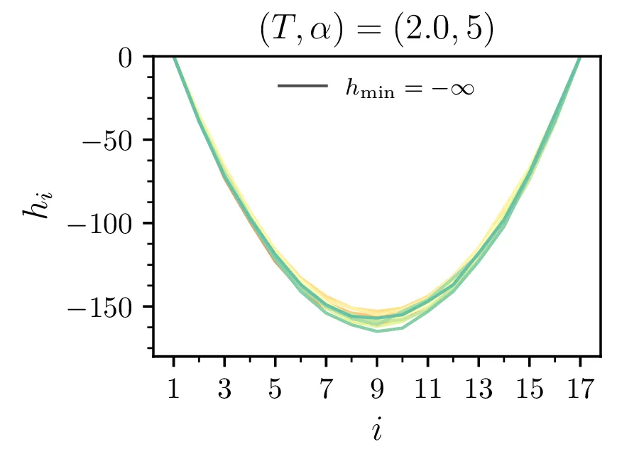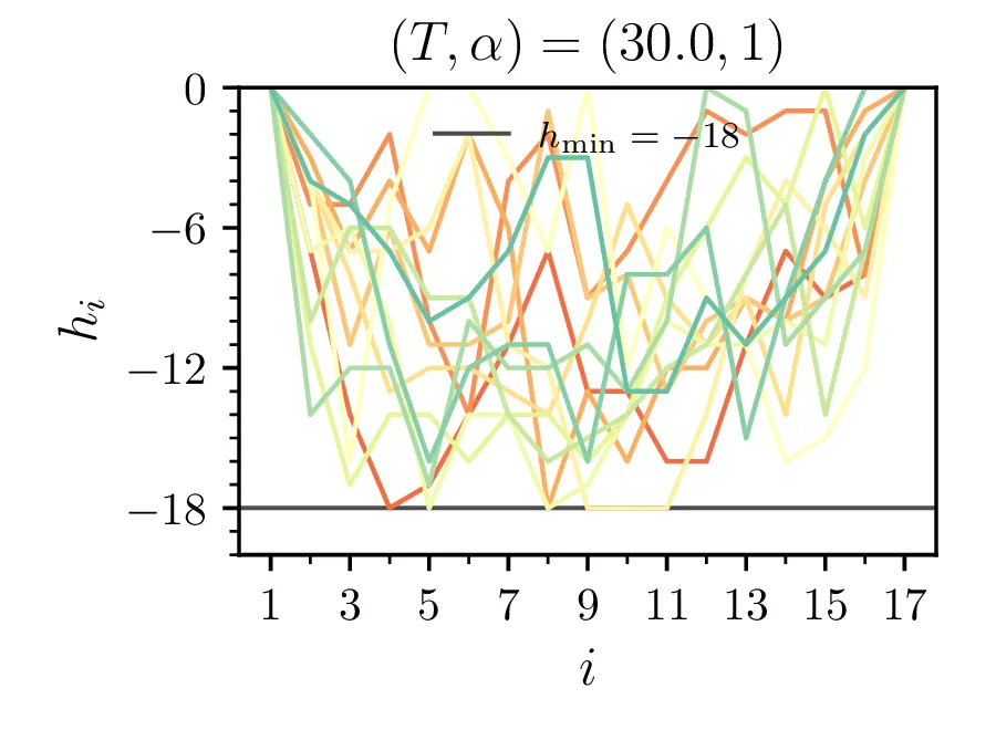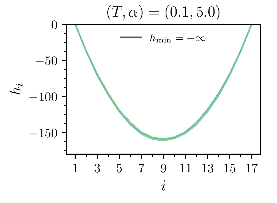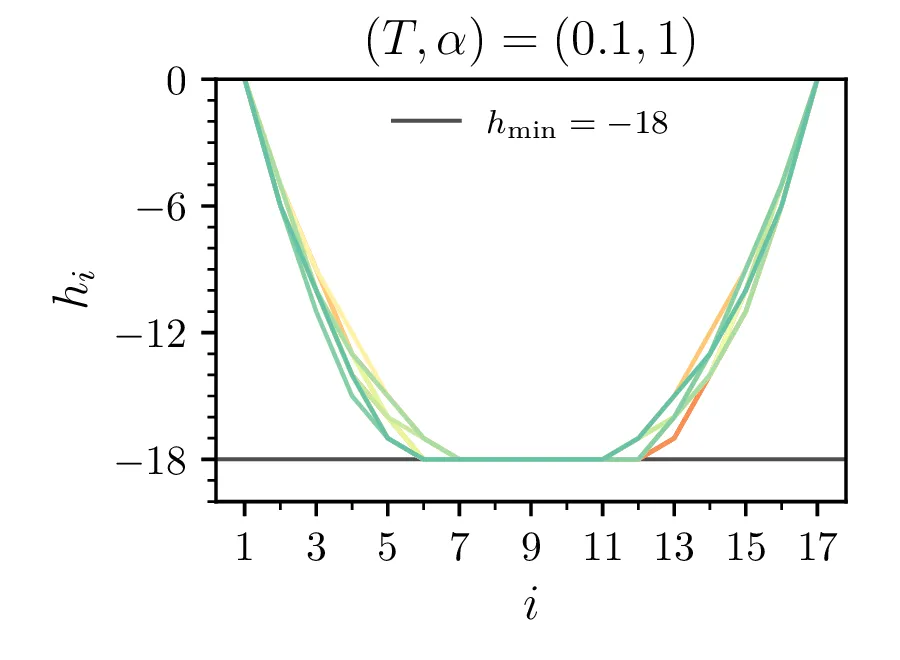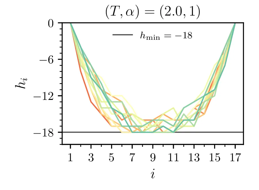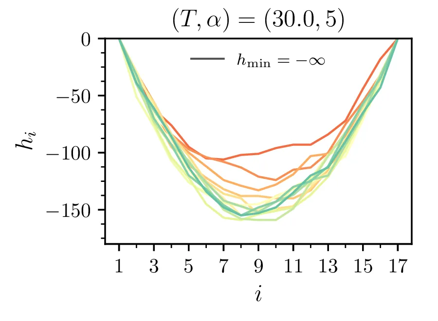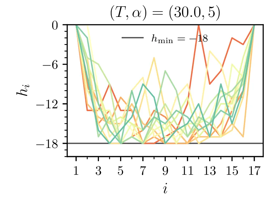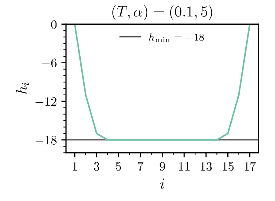 Začnemo z neko naključno porazdelitvijo \(h_i \sim U(0, \mathop{\mathrm{max}}(-20, h_\mathrm{min}))\), le za \(h_1 = h_{17} = 0\).