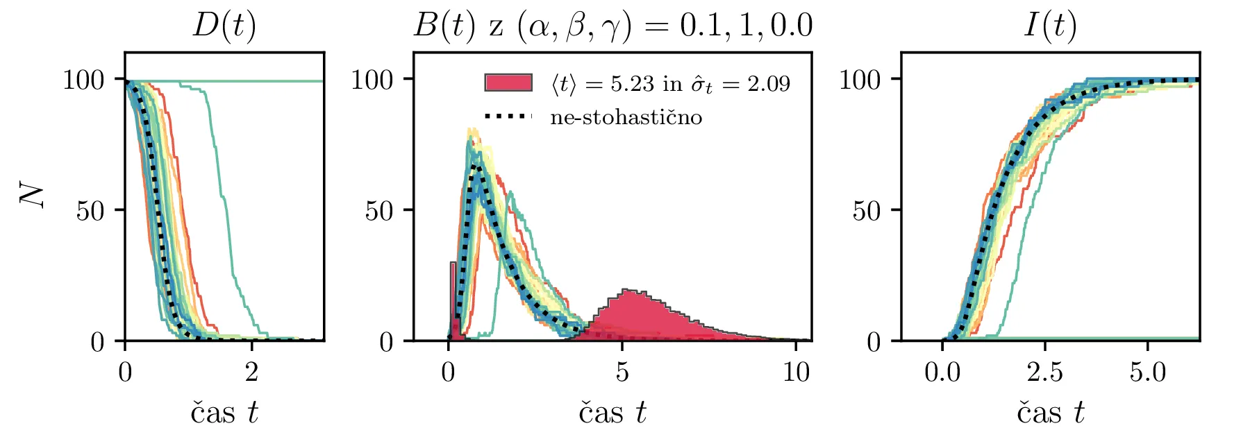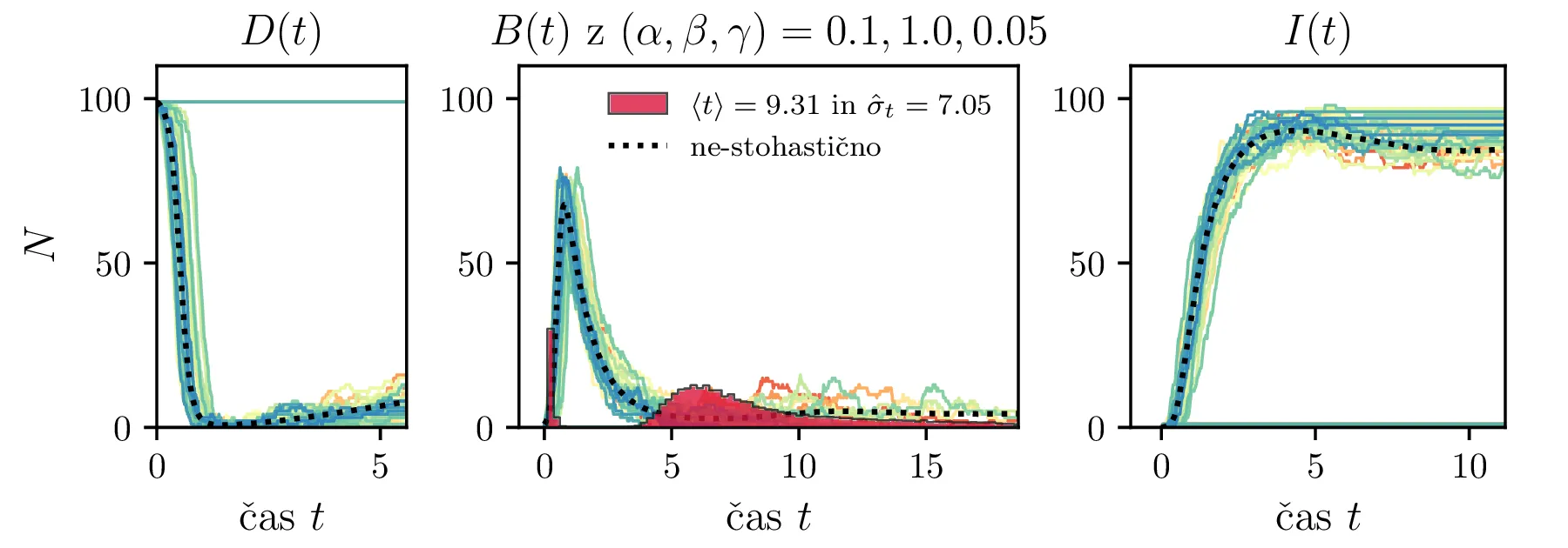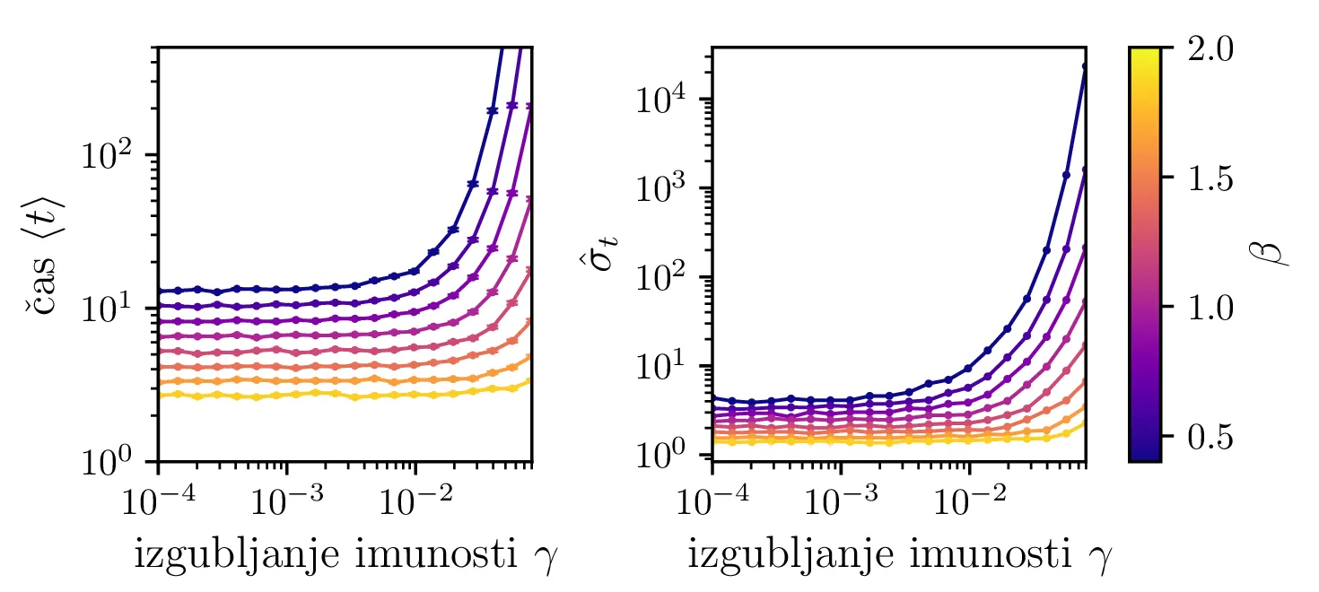 Podobno kot v 4. nalogi bomo časovni razvoj epidemije opisovali z sistemom diferencialnih enačb za tri razrede dovzetnih \(D\), bolnih \(B\) in imunih \(I\). Dodali bomo tudi člen \(-\gamma I\), ki bo opisoval popuščanje imunosti v nekem času \(\tau_\mathrm{pop. imunosti} = \frac{1}{\gamma}\). Sistem ne-stohastičnih enačb tedaj zapišemo kot \[\begin{aligned} \dot{D} &= -\alpha DB + \gamma I, \nonumber \\ \dot{B} &= \alpha DB - \beta B, \\ \dot{I} &= \beta B - \gamma I \nonumber. \end{aligned}\] Preprosto je videti, kako tak zvezni model preslikamo v sistem stohastičnih diferencialnih enačb. Kar brez dolgovezenja zapišemo \begin{equation}\begin{aligned} &D(t + \Delta t) = D(t) -\mathcal{P}(\alpha DB \Delta t) + \mathcal{P}(\gamma I \Delta t), \nonumber \\ &B(t + \Delta t) = B(t) + \mathcal{P}(\alpha DB \Delta t) - \mathcal{P}(\beta B \Delta t), \label{eq:stohastic-DBI} \\ &I(t + \Delta t) = I(t) + \mathcal{P}(\beta B \Delta t) - \mathcal{P}(\gamma I \Delta t) \nonumber. \end{aligned}\end{equation} Na sliki 16 vidimo primerjavo med procesom za model pri \(\gamma = 0\), t. j. ko pridobljena imunost pacienta ne popusti in modelom z neko hitrostjo popuščanja \(\gamma = 0.05\). Tako popuščanje znatno podaljša epidemijo, kar se pozna na veliko daljšem desnemu repu histograma po časih konca epidemije. Poveča se tako povprečni čas kot tudi njegova varianca, eksplicitno to narišemo na sliki 18, kjer je vidno, da za dovolj majhne \(\beta = 1\), t. j. za dolgožive bolezni, trajanje epidemije zelo občutljivo na popuščanje imunosti. Da je to res pogojeno s kombinacijo dolgožive bolezni in z popuščanjem imunosti, lahko vidimo z uvedbo parametra \(\Gamma :=\frac{\gamma}{\beta}\), kjer je odvisnost lepša in kriterij za izjemno dolgo trajajočo epidemijo je približno \[\Gamma > \Gamma_c, \quad \Gamma_c \approx 0.05,\] kot to vidimo na sliki 18 spodaj, kjer vsi časi hkrati poskočijo nekje približno pri \(\Gamma_c \approx 0.05\). Za večje \(\Gamma \gg \Gamma_c\) so epidemije pričakovano lahko izjemno dolge, kot to vidimo vsaj ilustrirano na primeru 17.