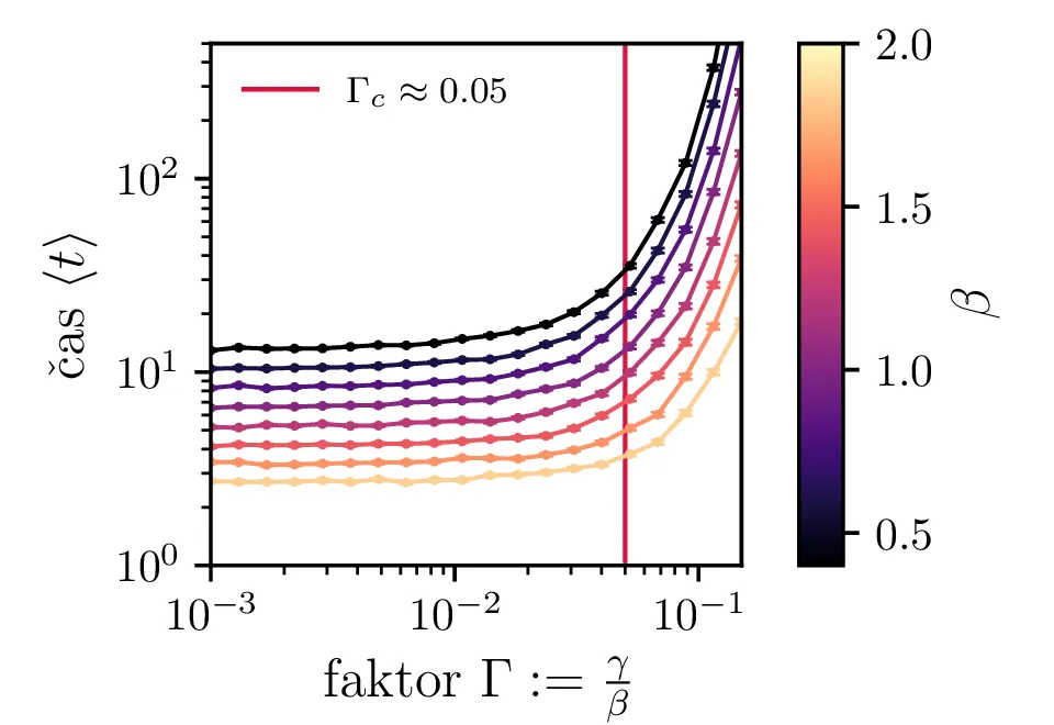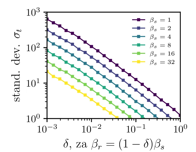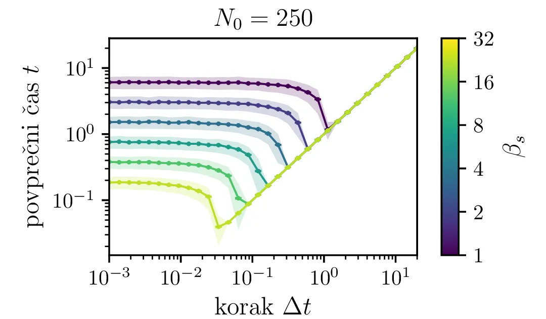 Na sliki 7 je narisana odvisnost povprečnih časov za neko izbiro hitrosti procesa \(\beta_s\) od koraka stohastične integracije. Kot pričakovano je potrebna za smiseln rezultat dovolj velika resolucija, t. j. dovolj majhen \(\Delta t\). Za večje \(\beta_s\) je tipično potrebna izbira manjšega koraka.