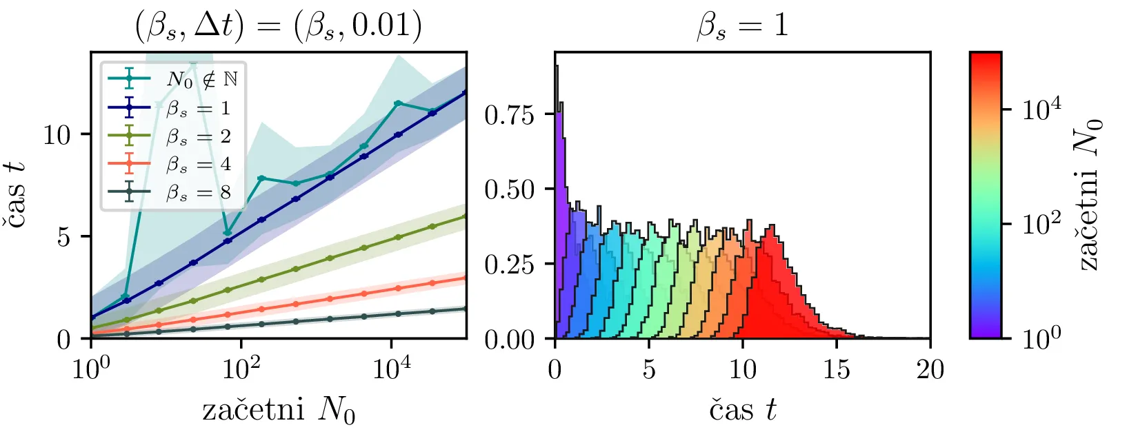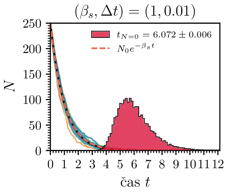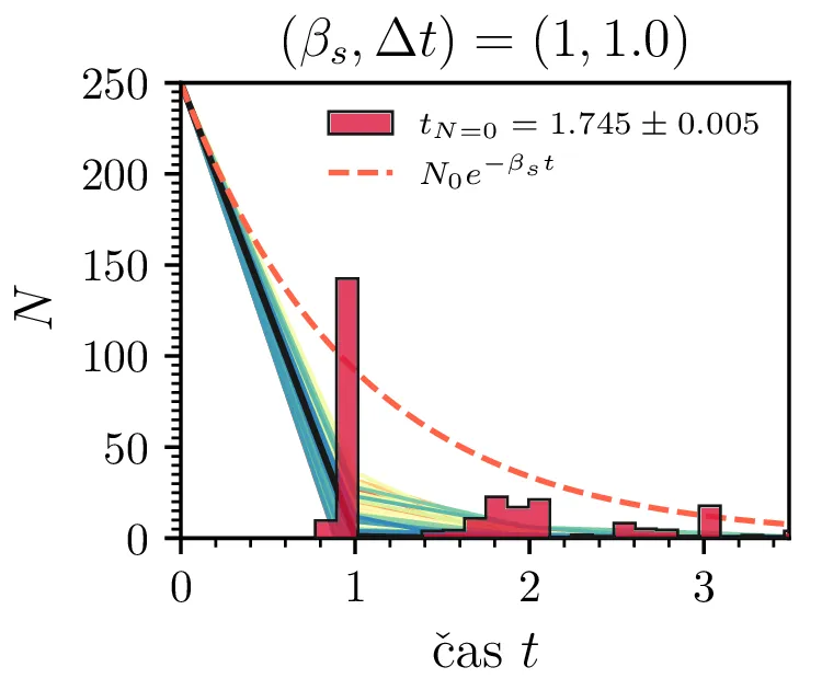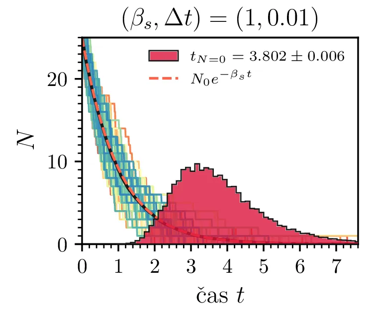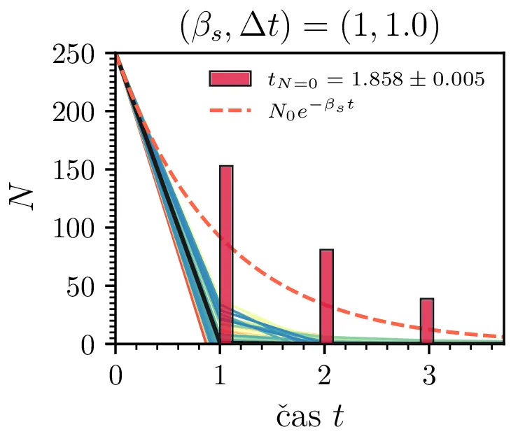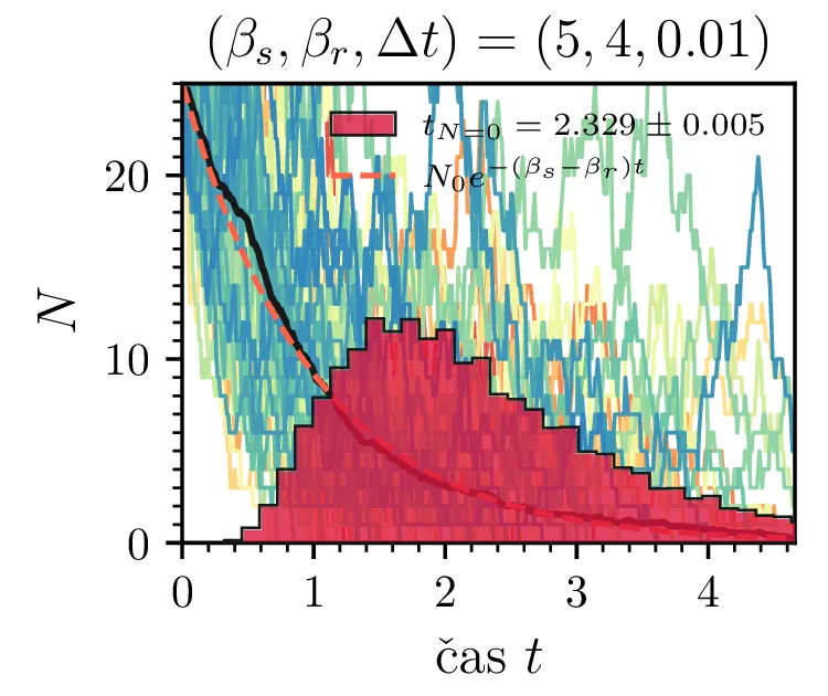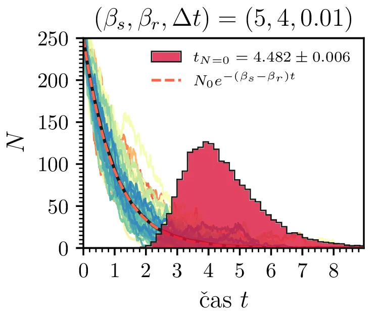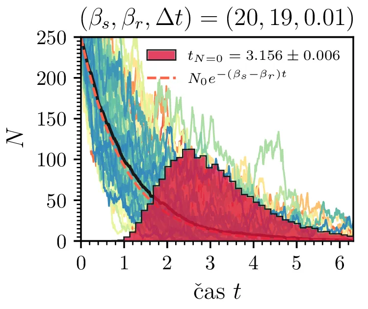 Prvo si pogledamo preprost model izumrtja, pri katerem začetno populacijo \(N(t = 0) = N_0\) zmanjšujemo stohastično kot \[N(t + \Delta t) = N(t) - \mathcal{P}(\beta_s N \Delta t),\] pri čemer je \(\mathcal{P}(\lambda)\) naključno število žrebano iz Poissonove porazdelite s povprečjem \(\lambda\). Povprečje \(\lambda = \beta N \Delta t\) je v osnovi eksponentno, tako da je \(\dot{N} \propto N\). V model izumiranja lahko dodamo še pojav rojstev, z dodatnim stohastičnim členom \begin{equation}N(t + \Delta t) = N(t) - \mathcal{P}(\beta_s N \Delta t) + \mathcal{P}(\beta_r N \Delta t). \label{eq:stohastic-de}\end{equation} V zvezni sliki ne-stohastične diferencialne enačbe bi to pomenilo rešitev združenih eksponentov \(N(t) = N_0 e^{-(\beta_s - \beta_r) t}\). A v stohastični sliki ima to dodatno posledico v tem, da porazdelitev časov izumrtja razširi. To lahko vidimo na sliki 1 kjer primerjamo med modelom izumrtja in modelom izumrtja z rojstvi, za začetno populacijo \(N_0 = 25\). To lahko razširimo tudi na primera \((\beta_s, \beta_r) = (5, 4)\) in \((20, 19)\) za večjo začetno populacijo na sliki 3.