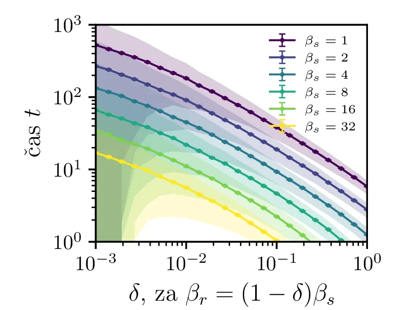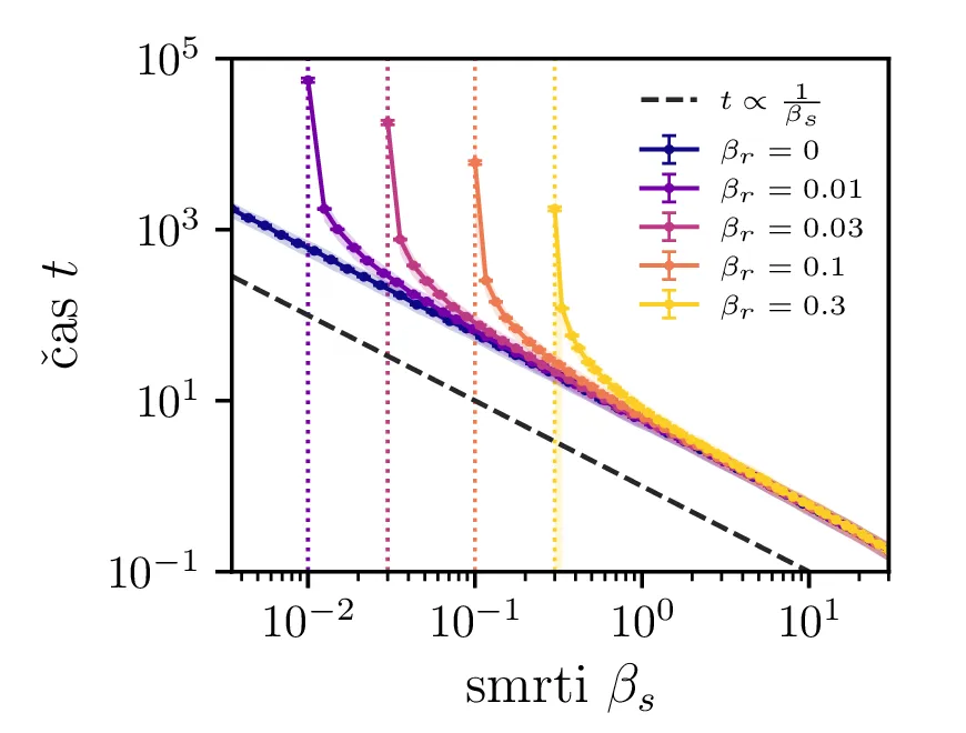 Na sliki 4 v log-linearni skali vidimo kako povprečen čas potreben za izumrtje logaritemsko narašča z velikostjo začetne populacije. Vidim lahko tudi napačen način računanja, kjer za \(N_0\) vzamemo necelo število, to pa povzroči statistično povsem nesmiselne rezultate, kjer se populacij zatakne pri nekem majhnem realnem številu \(N \in (0, 1)\). Poleg začetne velikosti populacije na povprečen čas izumrtja vpliva tudi hitrost izumiranje \(\beta_s\). Kot vidimo na sliki 5, je za \(\beta_s \ll \beta_r\) ta odvisnost smiselna in intuitivna \(t \propto \frac{1}{\beta_s}\). A za \(\beta_r \approx \beta_s\) ta čas močno naraste, saj je obnašanje bolj difuzivno, poleg smrti, ki premikajo \(N\) navzdol, so prisotna tudi rojstva, ki premikajo \(N\) navzgor. Bolj podroben pogled na te pole, kjer čas in njegova varianca narasteta, vidimo na sliki 6.