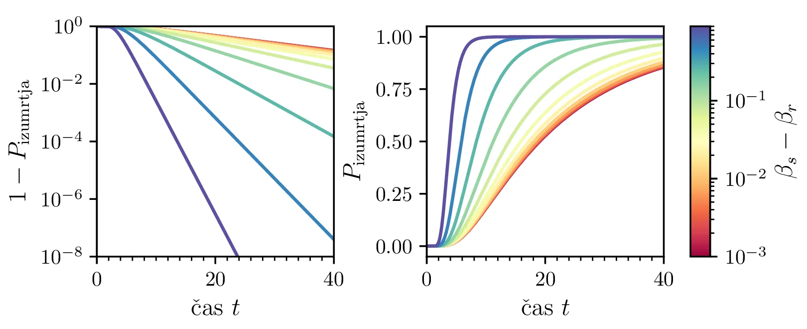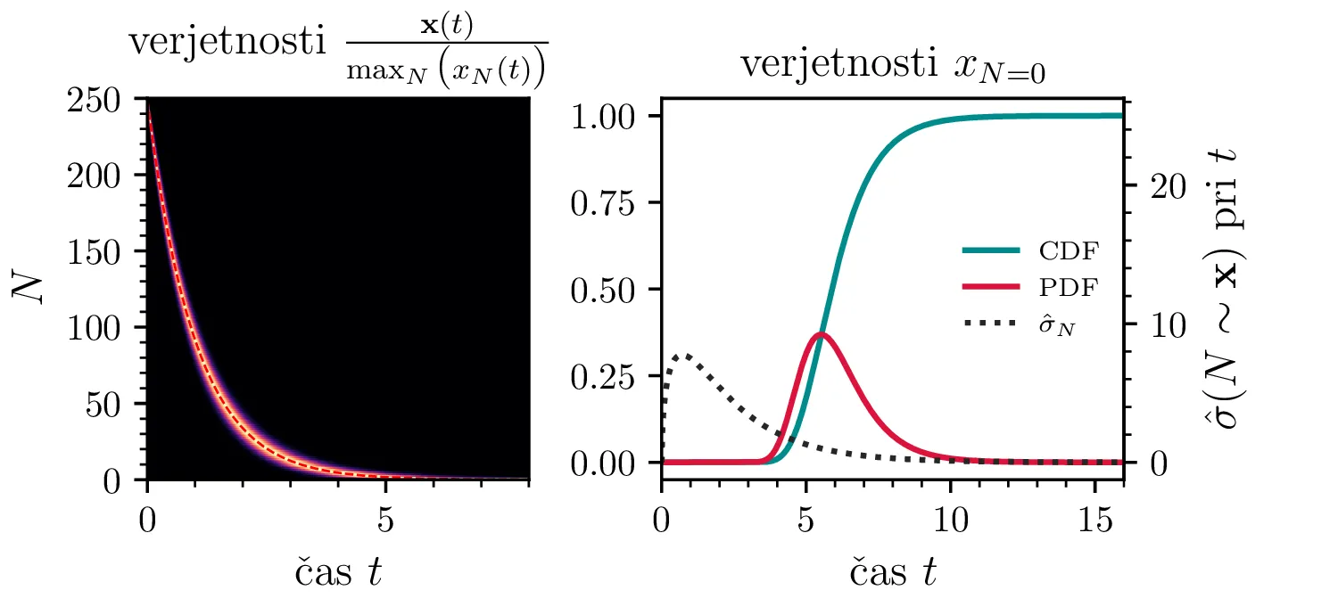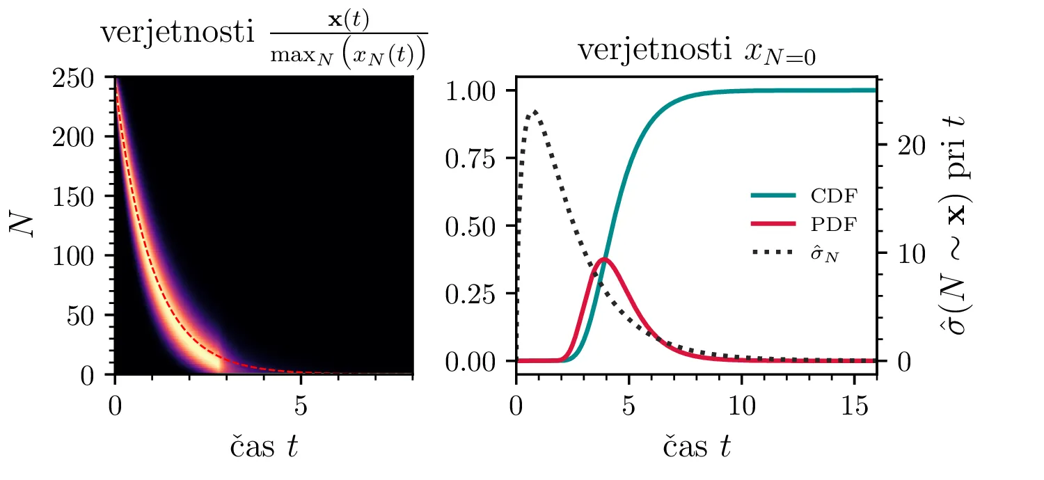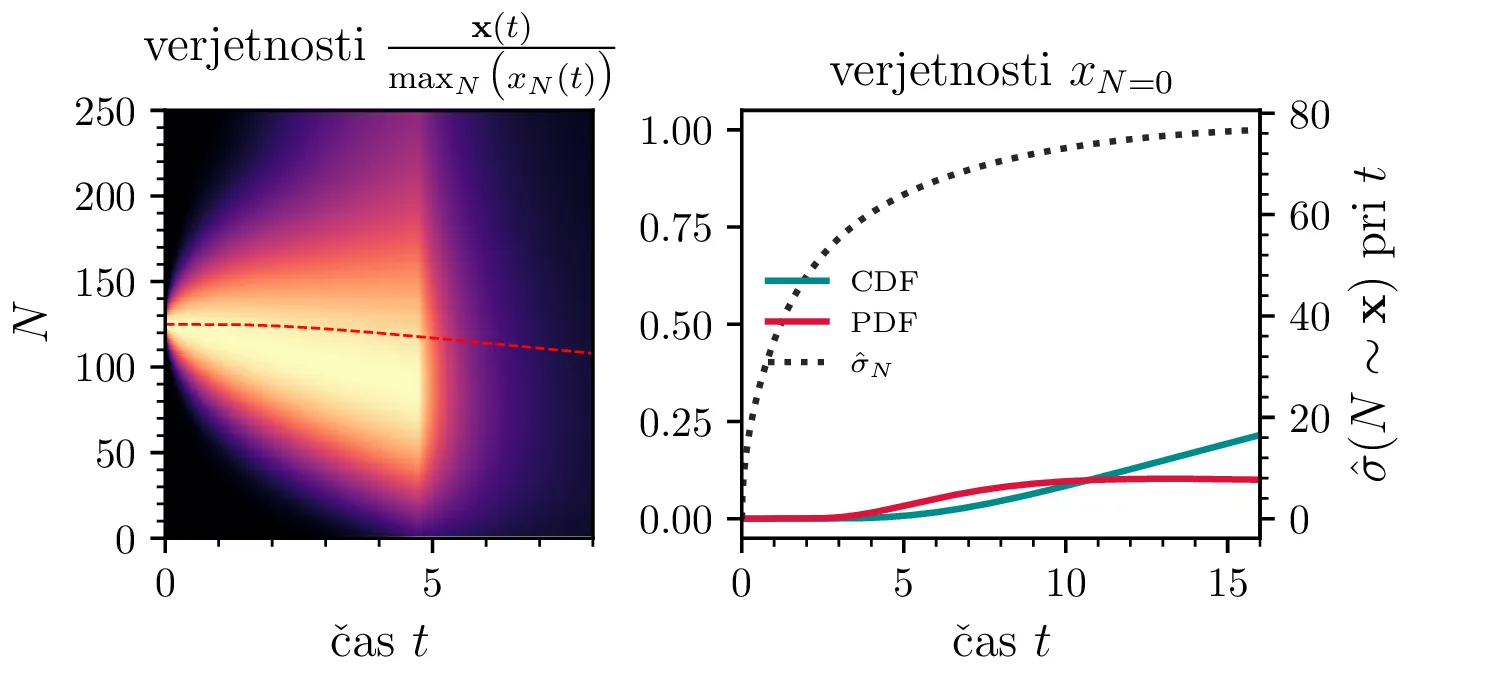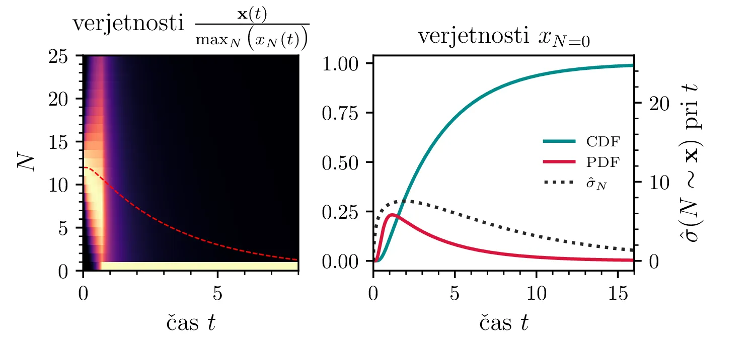 Namesto ansambla žrebanih rešitev stohastične diferencialne enačbe 1 lahko problem prevedemo na stohastični proces, konkretno Markovsko verigo, ki opisuje evolucijo porazdelitvenega vektorja. Primer takega vektorja za populacijo \(0 \ge N \ge N_0\) in \(N_0 = 9\) je zapisan kot \[\mathrm{x}_9 = \begin{pmatrix} p_{N = 0} & p_{N = 1} & \dots & p_{N = 8} & p_{N = 9} \end{pmatrix}^T.\] Če nas zanima evolucija porazdelitev za populacijo \(N(t = 0) = N_0\), je začetna porazdelitev pri času \(t = 0\) oblike \[\mathrm{x}_9(t = 0) = \begin{pmatrix} 0 & 0 & \dots & 0 & 1 \end{pmatrix}^T.\] Za čase \(t > 0\) lahko porazdelitev razvijemo kot matrično množenje \[\mathbf{x}(t + h) = M \mathbf{x}(t),\] pri čemer je Markovska matrika, t. i. prehodna matrika oblike \[M_9 = \begin{pmatrix} 1 & S h \\ 0 & 1 - 1(B + S) & 2S \\ & B & 1 - 2(B + S) & 3S \\ & & \ddots & \ddots & \ddots \\ & & & 7 B & 1 - 8(B + S) & 9 S \\ & & & & 8 B & 1 - 9 S \end{pmatrix},\] pri čemer sta \(B\) in \(S\) le okrajšavi za \[B :=\beta_s \Delta t, \quad S :=\beta_r \Delta t.\] Na sliki 8 zgoraj vidimo evolucijo porazdelitve pri zaporednih množenjih z matriko za \(\beta_s = 1\). Začetna porazdelitev z ničelno varianco se razširi, nato pa počasi premakne proti stacionarni porazdelitvi \(\mathbf{x} = (1, 0, \dots, 0, 0)\), ki pomeni izumrtje populacije. Na sliki 8 desno zgoraj vidimo tudi odvisnost \(\sigma_N\) od časa, v rdeči in modri barvi pa tudi CDF in PDF verjetnosti za izumrtje. Prav tako kot smo to ugotovili za stohastično diferencialno enačbo 1 se ob dodatku \(\beta_r > 0\) verjetne trajektorije razširijo (slika 8 spodaj). Kako točno \(\beta_r > 0\) vpliva na potek izumiranja, najlepše vidimo na sliki 9, kjer rišemo kumulativno verjetnost izumrtja po času za \(\beta_s = 1\) in malo manjši \(\beta_r = \beta_s - \varepsilon < 1\).