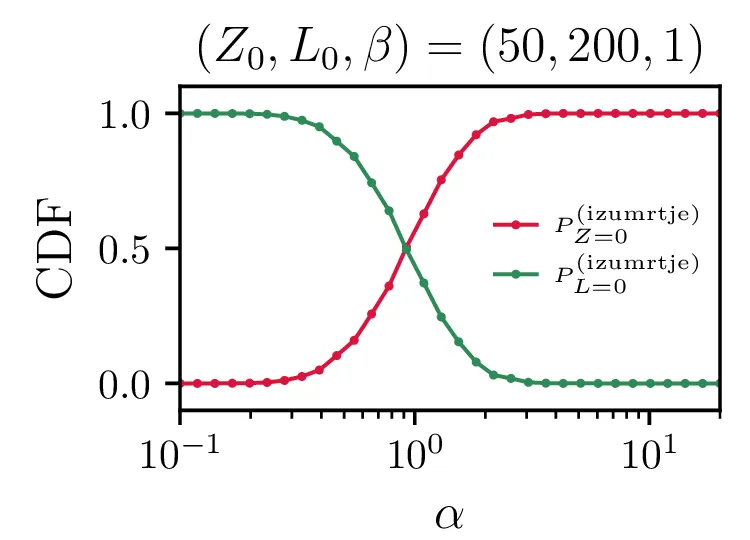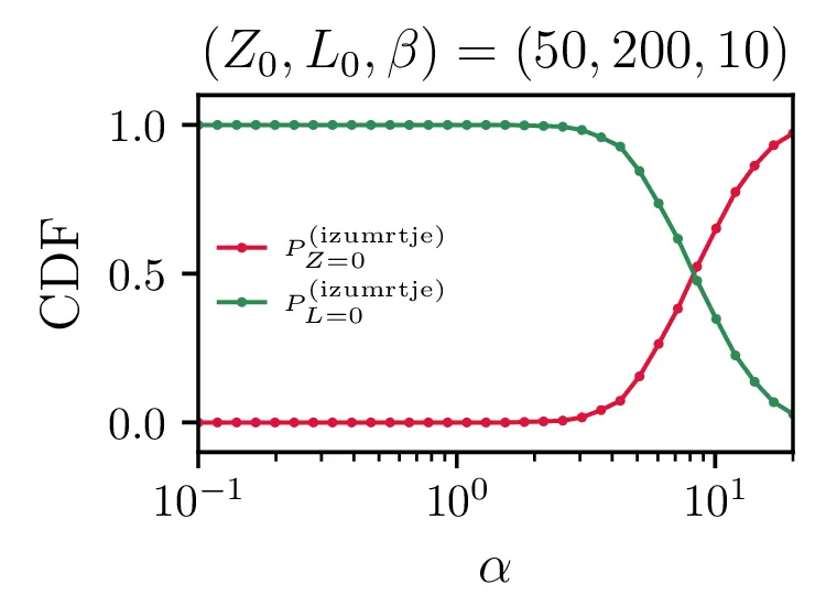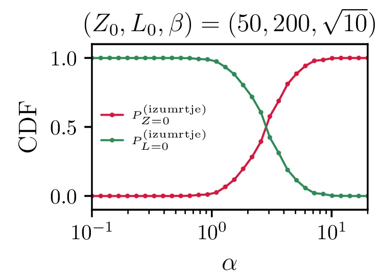 Še bolj eksplicitno je prehod med tema dvema režimoma izumiranj prikazan na sliki 14, kjer je očiten prehod iz izumiranja lisic za \(\alpha \ll \beta\) v izumiranje zajcev za \(\alpha \gg \beta\).