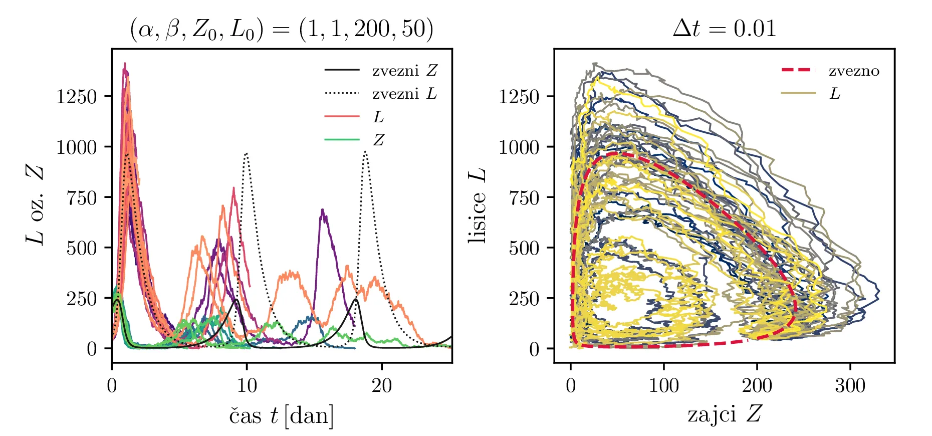 Stohastični Lotka-Volterra model opišemo z stohastično diferencialno enačbo, kjer rojstva in smrti opišemo z nasprotno predznačenimi Poissonovskimi \(\mathcal{P}\) členi, predacijo pa prav tako z Poissonovskimi členi \(\propto ZL\). Sistem stohastičnih enačb je torej \begin{equation}\begin{aligned} &Z(t + \Delta t) = Z(t) + \mathcal{P}(5\alpha Z \Delta t) - \mathcal{P}(4 \alpha Z \Delta t) - \left( \frac{\alpha ZL }{L_0} \right), \nonumber \\ &L(t + \Delta t) = L(t) + \mathcal{P}(4\beta L \Delta t) - \mathcal{P}(5 \beta L \Delta t) + \left( \frac{\beta ZL }{Z_0} \right), \label{eq:stohastic-lotka} \end{aligned}\end{equation} kar v zvezni ne-stohastični sliki ustreza sistemu navadnih diferencialnih enačb \[\begin{aligned} &\dot{Z} = \alpha Z - \alpha \frac{ZL}{L_0}, \nonumber \\ &\dot{L}= -\beta L + \beta \frac{ZL}{Z_0}. \end{aligned}\] Na sliki 11 vidimo primer 40 shohastičnih potekov \(Z, L\) populacij. V osnovi je obnašanje še vedno ciklično, le pri vsakem ciklu obstaja v minimumu populacije za vrsto možnost izumrtja le-te vrste. To se še lepše vidi na histogramih na sliki 15, kjer so v zgornji vrsti predstavljeni histogrami vseh izumrtij po času, v sredinski in spodnji vrsti pa vidimo histograme ločeno za izumrtja ene in druge vrste (zajcev in lisic). V teh ločenih histogramih vidimo jasne vrhove povečane verjetnosti za izumrtje vrste, ki ustrezajo periodičnih minimumom populacije za to vrsto.