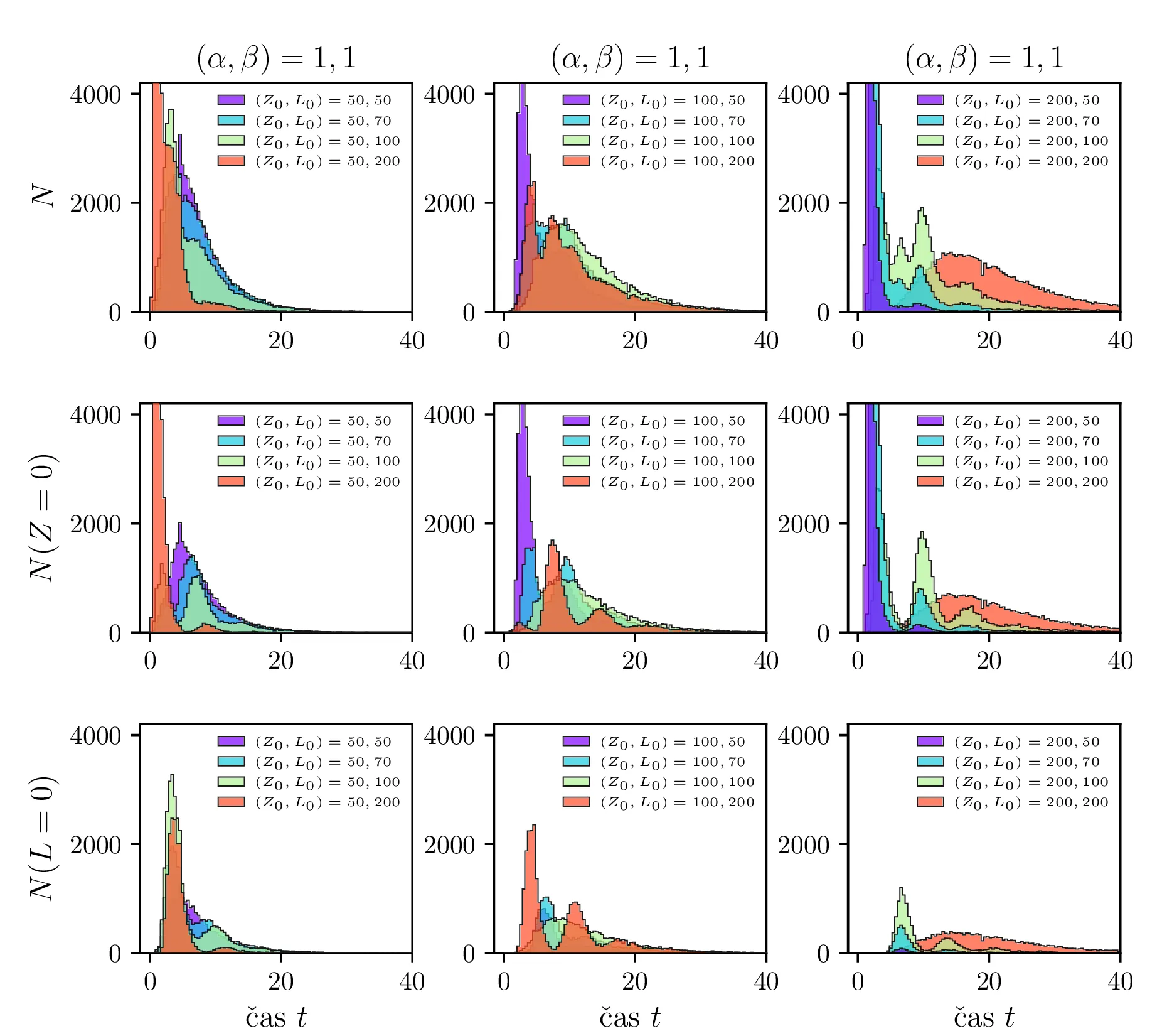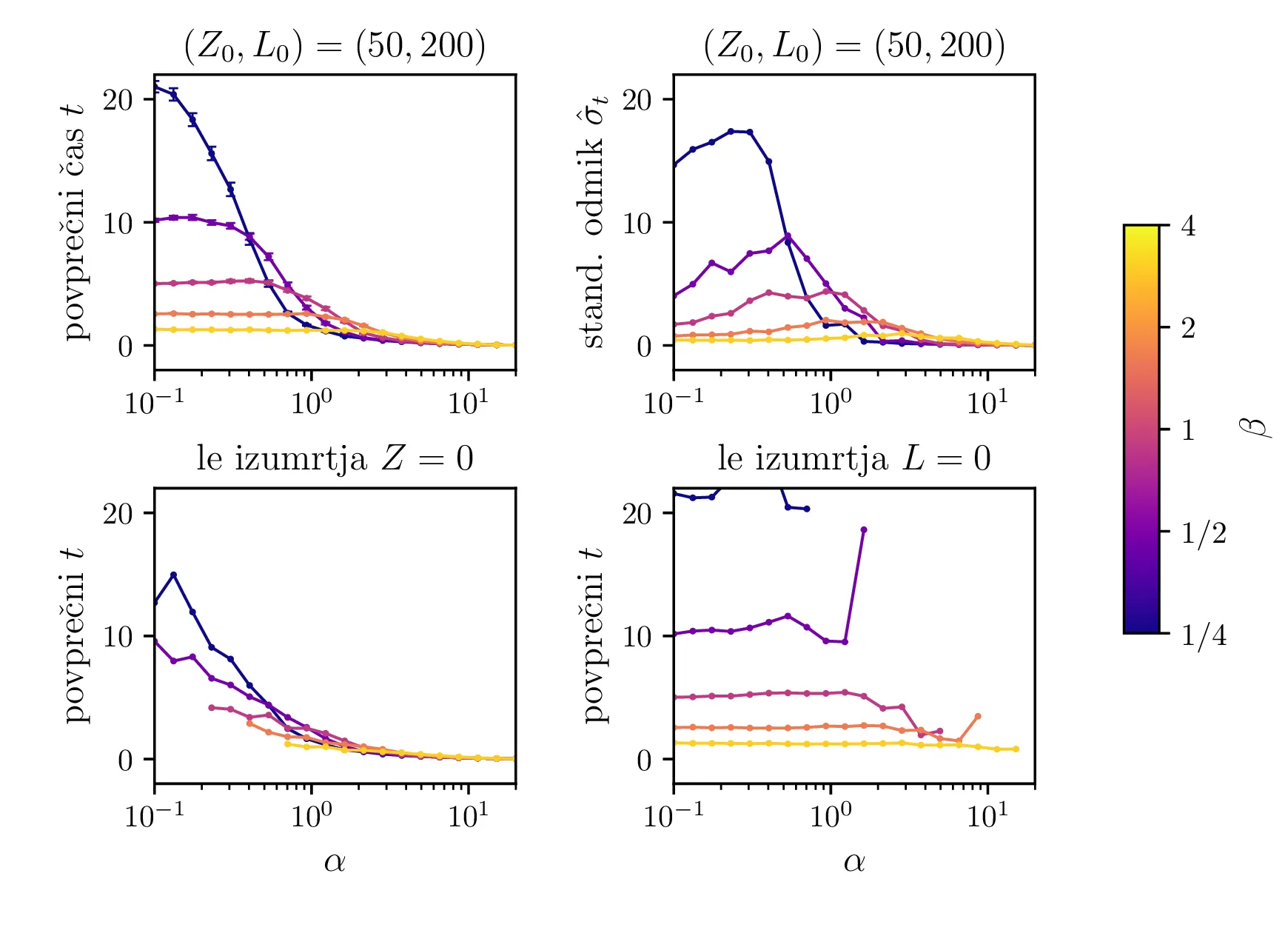 Na sliki 12 so predstavljeni povprečni časi izumrtja za različne hitrosti \(\alpha\) in \(\beta\). Spet ločimo dogodke izumrtja na izumrtja zajcev \(Z = 0\) in izumrtja lisic \(L = 0\). Na sliki 12 spodaj se ločeno vidita povprečna časa za izumrtja zajcev in izumrtja lisic. Za \(\alpha \ll \beta\) na grafu izumrtij \(Z = 0\) ni več točk, saj so dogodki tako redki, da jih sploh ne zajamemo (ali pa jih zajamemo res majhno število in je dobljeno povprečje povsem nezanesljivo). Obratno je za režim \(\alpha \gg \beta\) očiten manjko točk na grafu izumrtij \(L = 0\). V tem režimu so vice-versa izjemno redka izumrtja lisic.