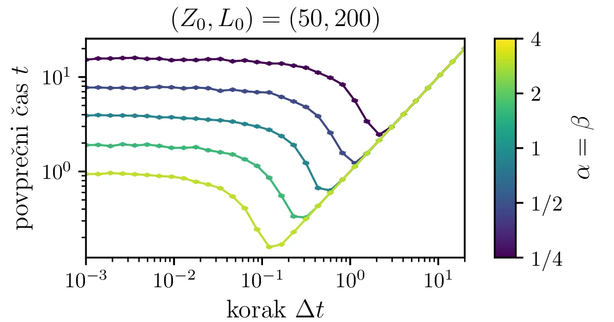 Na sliki 13 je narisana odvisnost povprečnih časov za neko izbiro \(\alpha = \beta\) od koraka stohastične integracije. Zgodba je povsem enaka kot s korakom integracije za proces izumiranja na sliki 7, potreben je dovolj majhen \(\Delta t\), za večje \(\alpha = \beta\) je potrebna izbira manjšega koraka.