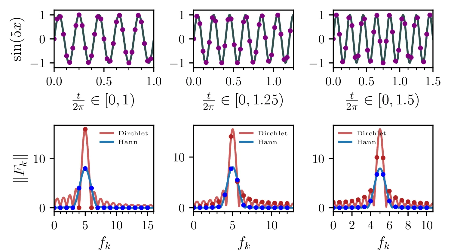 Prvo si poglejmo, kakšen učinek ima na spekter okenska funkcija signala. Najpreprostejši primer kvadratne oz. Dirchletove okenske funkcije vidimo na sliki 1. Vidimo, kaj točno pomeni pojav spektralnega uhajanja, t. j. pojav novih lažnih frekvenc, ki so posledica končnega vzorčenja. Poleg Dirchletove je v uporabi tudi mnogo drugih spektralnih funkcij (glej sliko 2), ki se razlikujejo v tem, kako močno zadušijo spektralno puščanje. Osnovna zahteva za okensko funkcijo je, da ohrani signal v čim večji širini okna, na njegovih robovih pa ima vrednost \(0\).
