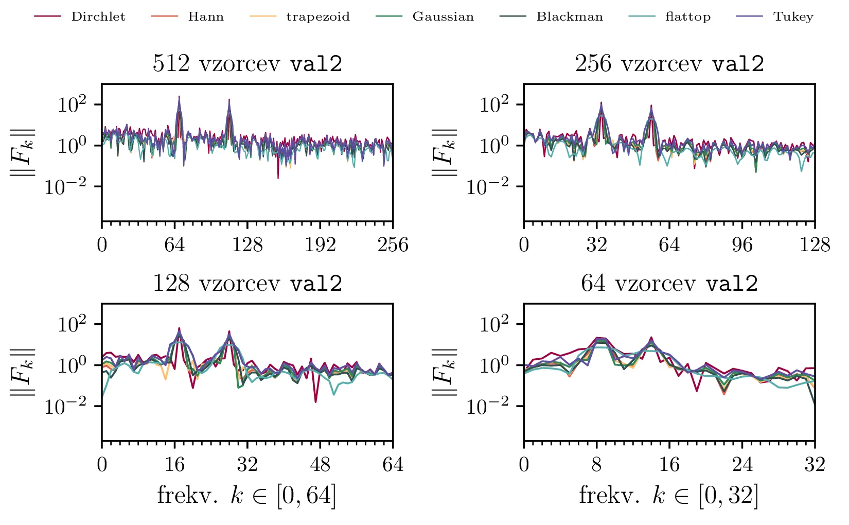 Za signala iz datotek val2.dat in val3.dat (glej sliko 5) poračunamo frekvenčni spekter in si ogledamo vpliv, ki ga ima na spekter uporaba različnih okenskih funkcij.