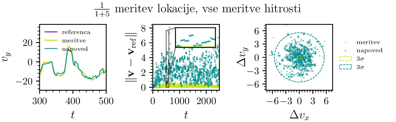 Pri gostih meritvah pozicij je torej Kalmanov filter zmožen zapolniti manjkajoče meritve hitrosti, preko ocene \(\hat{\mathbf{v}}_i = (\mathbf{r}_{i} - \mathbf{r}_{i-1}) / \Delta t\), ki pa je implicitna v samem delovanju Kalmanovega filtra. Zares se gre za popravke v obliki \begin{equation}v^+_n = v^-_n + K_{v, x} (z_x - x^-_{n}), \label{eq:position-to-velocity-corrections}\end{equation} kjer se inovacija v meritvi položaja prenese v novo napoved za hitrost. Da tak popravek zares zagotovi točnost napovedi, lahko vidimo na sliki 6, kjer umetno nastavimo \(2\times 2\) blok \(K_{\mathbf{v}, \mathbf{x}}\) na \(0\), ob čemer opazimo naraščanje napake za napoved hitrosti. Pričakovali bi lahko, da bi filter podobno nadomestil manjkajoče meritve pozicije, a ker pozicijo dobimo iz hitrosti z integracijo, se napake akumulirajo. Ob gostih meritvah hitrosti torej izpuščanje meritev pozicije vodi do precejšnjih odstopanj (slike 4), pri gostih meritvah pozicije pa lahko izpuščene meritve hitrosti v celoti nadomestimo (slika 5). Dodatna potrditev za to, da lahko natančne napovedi hitrosti dosežemo ali z gostimi meritvami hitrosti ali z gostimi meritvami pozicije, vidimo na sliki 8, kjer je napaka napovedi hitrosti zelo primerljiva za drugo vrstico, kjer imamo redke lokacije in goste hitrosti, in tretjo vrstico, kjer imamo goste lokacije in redke hitrosti.