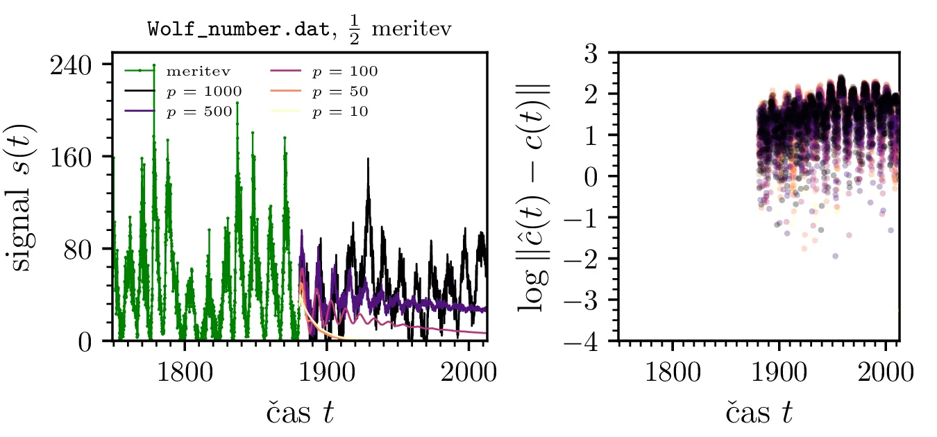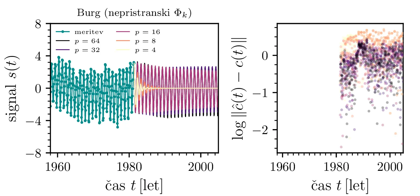 desno) RMSE odstopanje pravega signala od napovedih vrednosti. Napoved iz prve polovice podatkov je neuspešna,