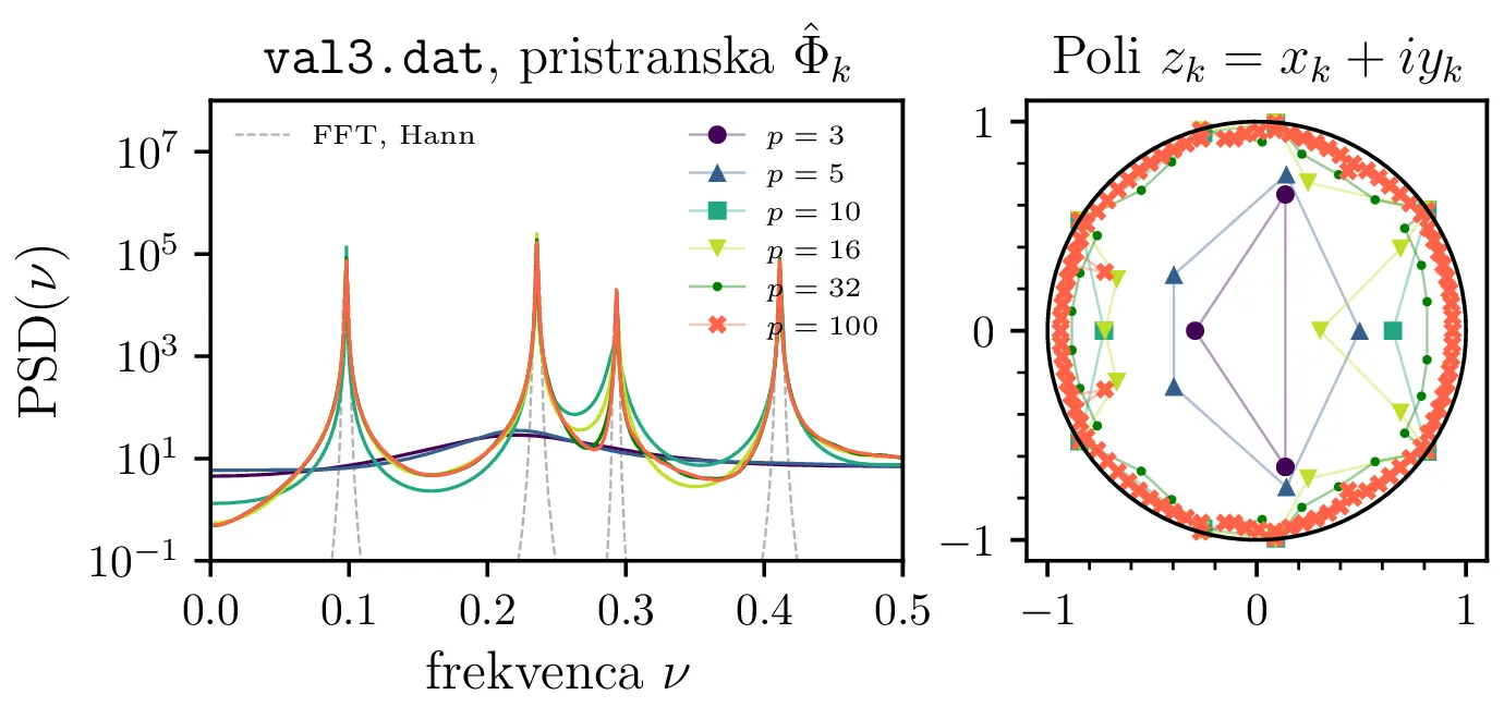 Na vseh slikah MEM ocen spektrov so narisani tudi položaji polov prenosne funkcije. Jasno opazimo, da so poli \(\{z_k\}_k\) nastopajo v konjugiranih parih, saj so za realen signal avtoregresijski koeficienti \(\{ a_k \}_{k = 1}^{p} \in \mathbb{R}\). Nekateri poli so izven enotske krožnice (npr. slika 9 levo), a za ocene spektrov je to brez pomena, saj smo pri vrednotenji stalno na enotski krožnici \(z = e^{i2\pi \nu}\).