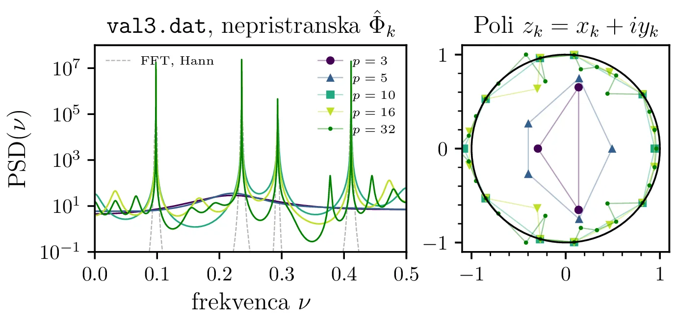 desno). Spektre \(\mathrm{PSD}(\nu)\) po metodi maksimalne entropije ocenimo z