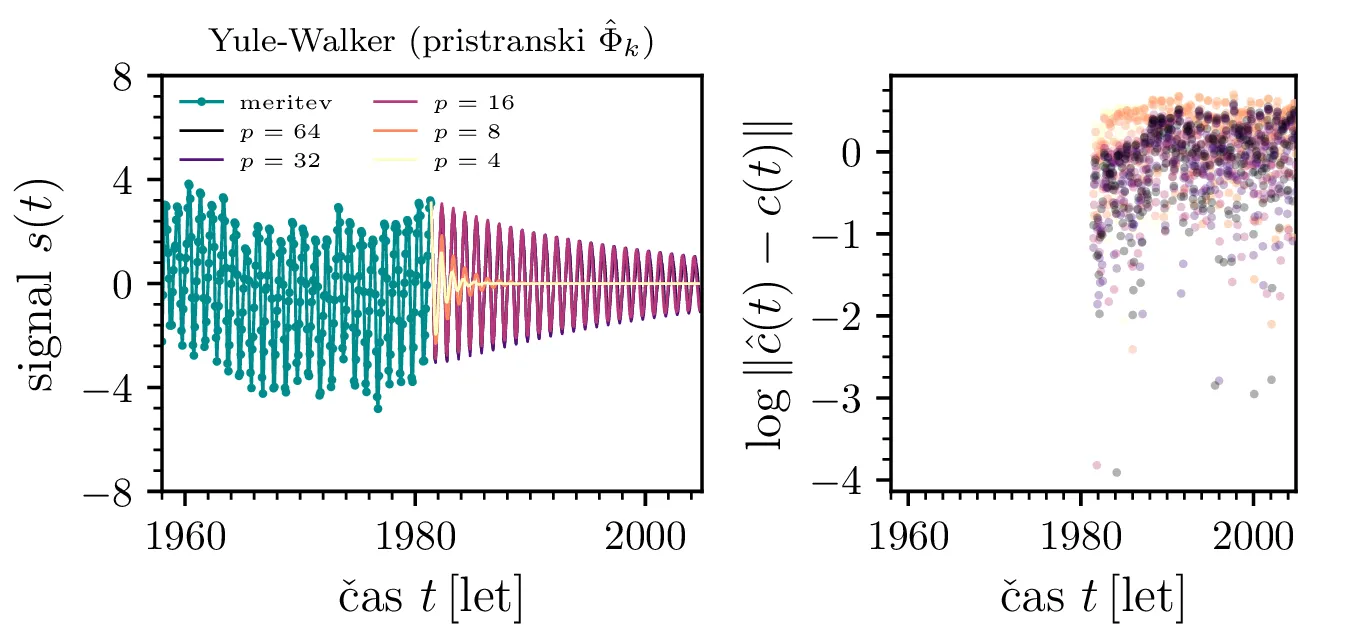 \(\mathrm{CO}_2\) signal na sliki 7; tu opazimo tudi numerično nestabilnost Yule-Walkerjeve metode, ko uporabljamo nepristransko oceno